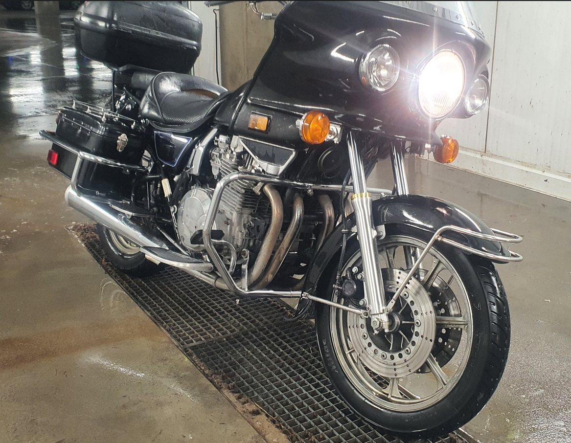 ТТХ: Engine type: 4-stroke, DOHC in-line four, 2 valves per cylinder Displacement: 998 cc Bore x Stroke: 69.4 mm × 66.0 mm Cooling: Air/Oil Power: 88 hp (66 kW) @ 9,000 rpm Torque: 60 lbf⋅ft (81 N⋅m) @ 6,500 rpm Carburetion: Mikuni Bs34 × 4 Transmission: 5-speed / Chain Rake / trail: 27.0 degrees / 110 mm Suspension: front 38 mm telescopic hydraulic fork Suspension: rear Swing arm with twin adjustable shocks Tire: front bead retention type MN 90-18 4PR Tire: rear bead retention type MR 90-18 4PR Brakes front, rear: Dual hydraulic discs / Single disc Overall length: 2,290 mm Overall width: 890 mm Overall height: 1,560 mm Ground clearance: 160 mm Seat height: 780 mm Curb weight, as from factory with fuel: 270 kg