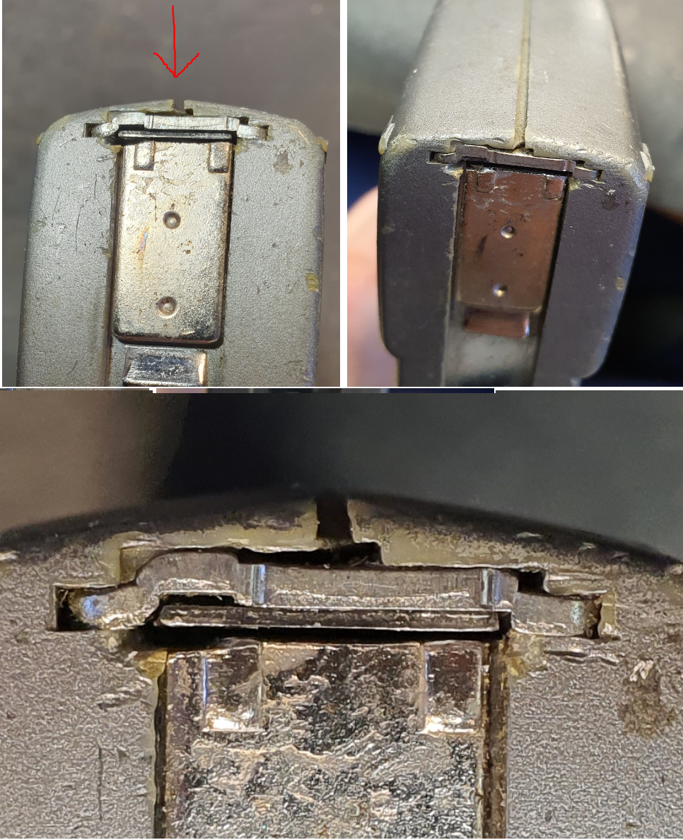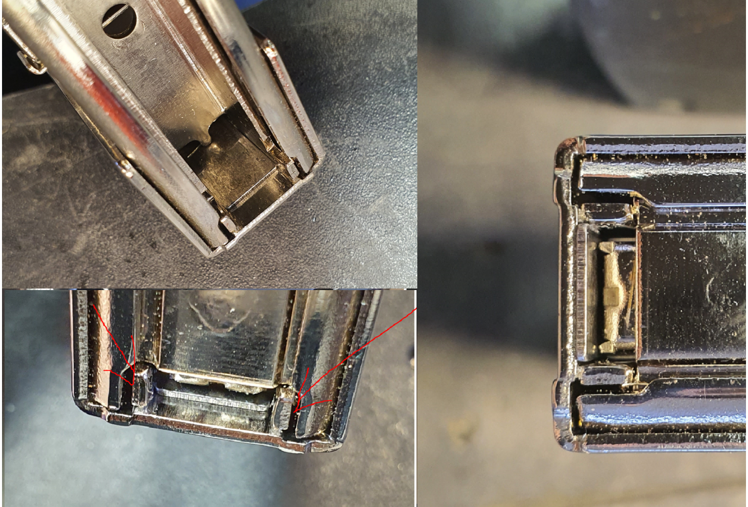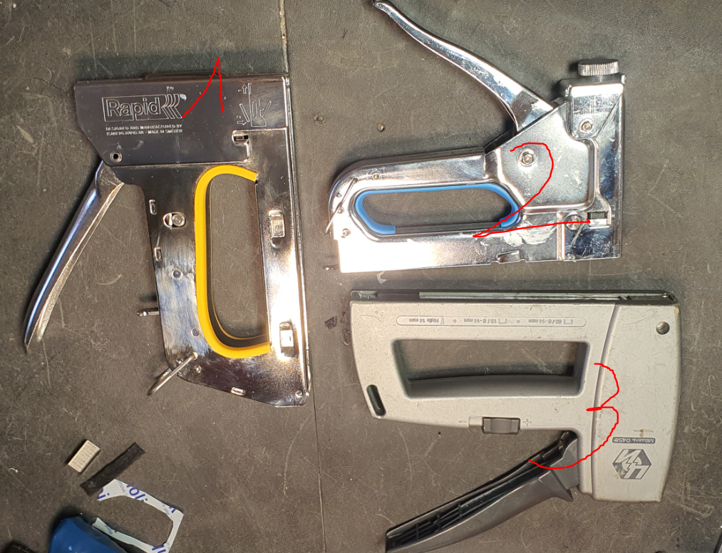 Стальной китаец (пикрил3) Передняя стенка китайца гладкая и не вызывает вопросов, но боковые ограничители выполнены не на стенке, а на съемном магазине для скобок и на нижней левой фотке видно, что от развигания их держат криво продавленные отверстия в передней стенке. У пистолета также довольно широкий зазор сзади молота и иногда случается застревание скобок, когда в щель пролазит сразу 2