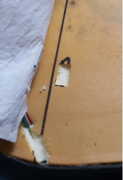Забрал. Снял кожу снова. Приклеил поролон. Подрезал. Ну.... вроде как-то скрывает край крелки. Конечно видно , перепад на поролоне есть. Но он не резкий.