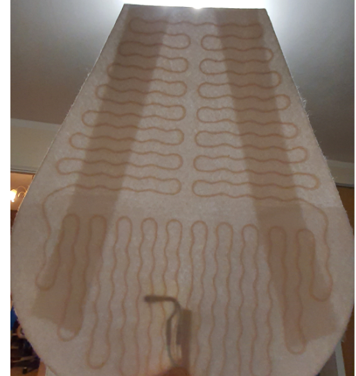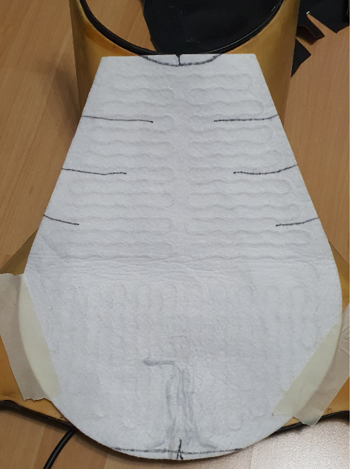 В общем прицелился и порезал грелку промеж проводочков Проковырял нычку для термодатчика (чтобы вверх не выпирал слишком) Просверлил/проковырял дырку для провода (ох чувствую, поебусь с этим) Приклеил грелку и сверху еще этой ваты синтетической, чтобы края грелки не светились через кожу.