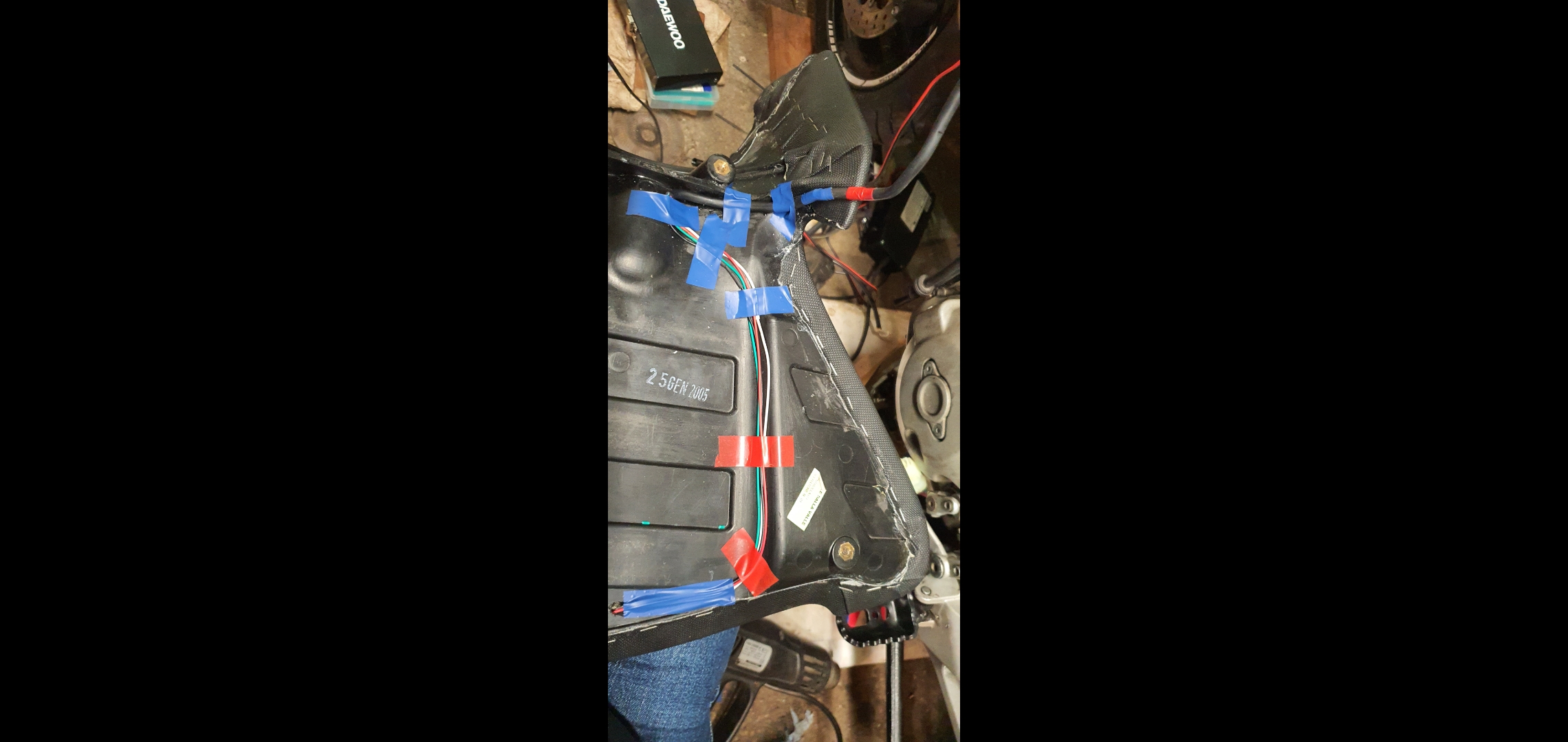 Посмотрел внимательно на профиль сидушки и бака, проложил (вчерновую пока) провода. Пока зафиксировал изолентой (начал с красной, понял что истинный кустомайзер делал бы только синей и перешёл на нее). Ещё раз, это временная фиксация, чтобы убедиться, что нигде сидушка не давит на провод.