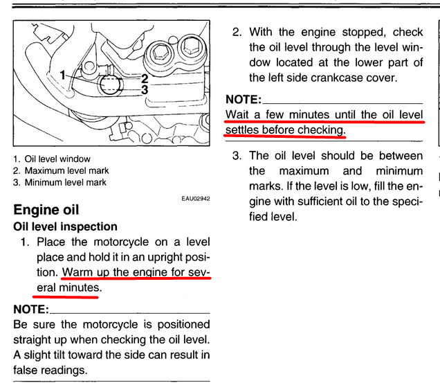 >надо подождать 5 минут чтобы уровень масла стабилизировался Кстати, в мануале с моего скрина про "подождать перед замером" вообще ничего нет. Но в каком-то другом тоже читал, что надо.