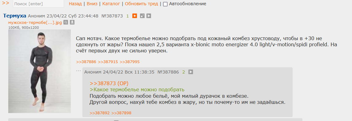 >>387873 (OP) >Какое термобелье можно подобрать Подобрать можно любое бельё, мой милый дурачок в комбезе. Другой вопрос, нахуй тебе комбез в жару, но ты почему-то им не задаёшься.