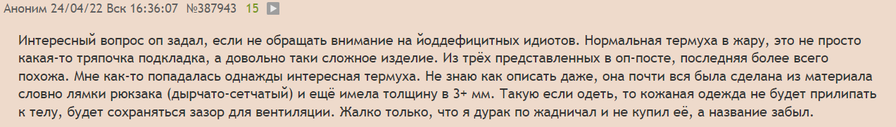 Интересный вопрос оп задал, если не обращать внимание на йоддефицитных идиотов. Нормальная термуха в жару, это не просто какая-то тряпочка подкладка, а довольно таки сложное изделие. Из трёх представленных в оп-посте, последняя более всего похожа. Мне как-то попадалась однажды интересная термуха. Не знаю как описать даже, она почти вся была сделана из материала словно лямки рюкзака (дырчато-сетчатый) и ещё имела толщину в 3+ мм. Такую если одеть, то кожаная одежда не будет прилипать к телу, будет сохраняться зазор для вентиляции. Жалко только, что я дурак по жадничал и не купил её, а название забыл.