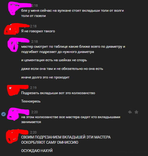 >>405917 Да хуй его знает, чесна Вроде бы и прав, но такое заявление точно не сочетается с пуканом-полторашкой >>405920 Всё началось с горящей лампочки масла, потом провернуло вкладыши и начались подгонки вкладышей от Газели, изготовление стальной шестерёнки для маслонасоса и ПОКРАСКА, которой не было конца. По сути, пуканидзе там лежит разобранный и готовый к сборке. Проблема лишь в подтёках лака, которые никто не увидит, но они очень мешают. Однако, не могу утверждать. Многое там делалось без меня и там может скрываться что-то невообразимо ужасное.