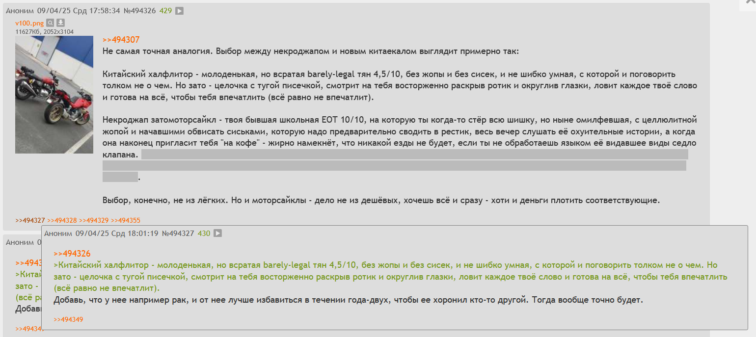 >>503434 В чём сычиность и феминность-то? Люди, о боже, задают вопросы про выбор (перво)мота? Охуеть теперь. Надо было как главный - родиться со знанием всех мотоциклов мира и всеми прилагающимися головными хворями впридачу.