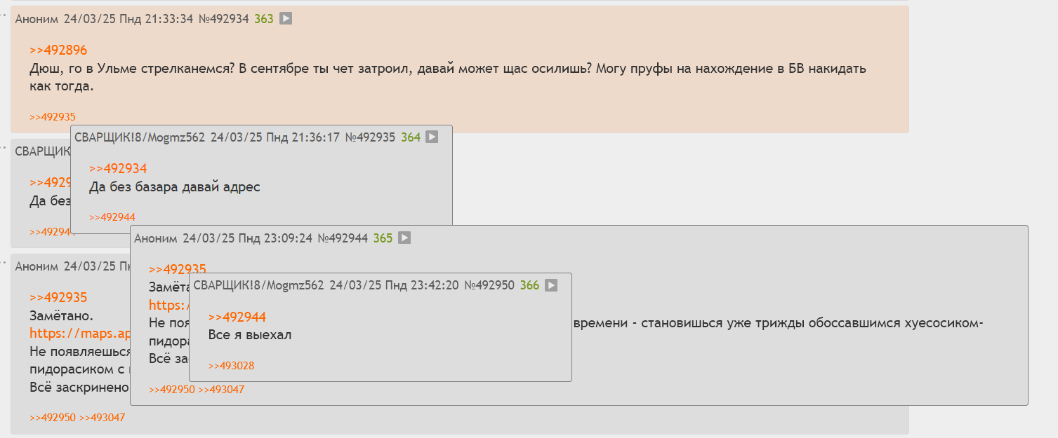 >Потом, естессно, будет вездет бегать и рассказывать, что вот он готов бить ебала 24/7, на стрелу в любое время дня и ночи, но все очкуют прост. >Обоссышь из города Ульма на два года ушёл в ридонли, пока я ждал его на обочине. Понимаю, тот факт, что я разнёс бы тебе ебалом даже бухим
