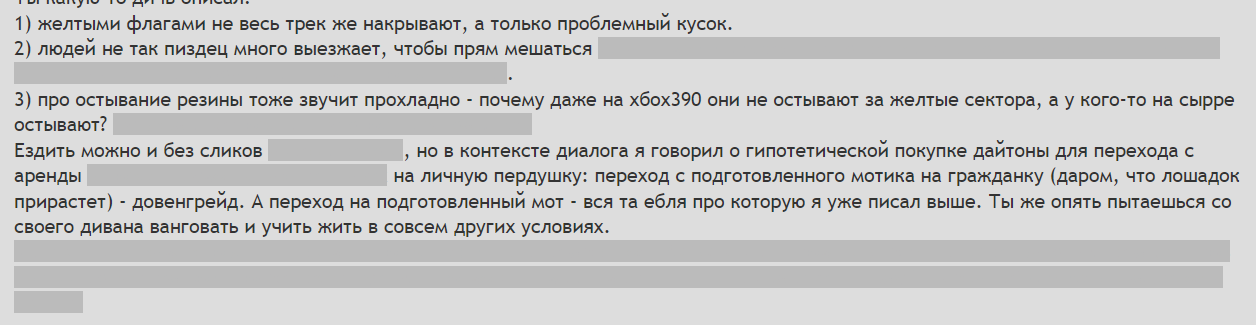 >>438047 >самый пососный сценарий Ты какую-то дичь описал: 1) желтыми флагами не весь трек же накрывают, а только проблемный кусок. 2) людей не так пиздец много выезжает, чтобы прям мешаться да и на мрв выезжают сразу на грелках и улетают вперед на всяких бншпанигалях, попробуй еще с ними потолкаться лел. 3) про остывание резины тоже звучит прохладно - почему даже на хбох390 они не остывают за желтые сектора, а у кого-то на сырре остывают? Ну кроме фактора его сутулости, разумеется. Ездить можно и без сликов и даже на гусе, но в контексте диалога я говорил о гипотетической покупке дайтоны для перехода с аренды которая по умолчанию на сликах на личную пердушку: переход с подготовленного мотика на гражданку (даром, что лошадок прирастет) - довенгрейд. А переход на подготовленный мот - вся та ебля про которую я уже писал выше. Ты же опять пытаешься со своего дивана ванговать и учить жить в совсем других условиях. Конкретный пример пока ты совсем не порвался: взносы на мрв стоят 20-30 за день, комплект резины 40, а скинуться на механиков - 5к. Это у вас там ровно обратная ситуация и возможно имеет смысл ездить по-демократичному "с паркинга" без всяких механов и грелок.