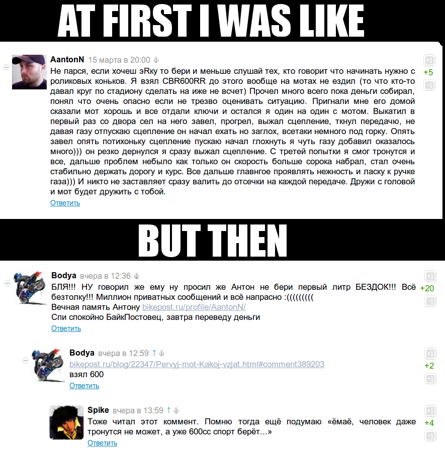 >>450830 МОТОЦИКЛЫ ДЛЯ ИДИОТОВ, Я ОЦЕНИВАЮ РИСКИ, В ЧЕМ УДОВОЛЬСТВИЕ ЕЗДИТЬ НА ТАКОМ ТРАНСПОРТЕ ГДЕ ЛЮБАЯ ОШИБКА МОЖЕТ ПРИВЕСТИ К ТРАВМЕ/СМЕРТИ, ЗАЧЕМ МНЕ ЭТО