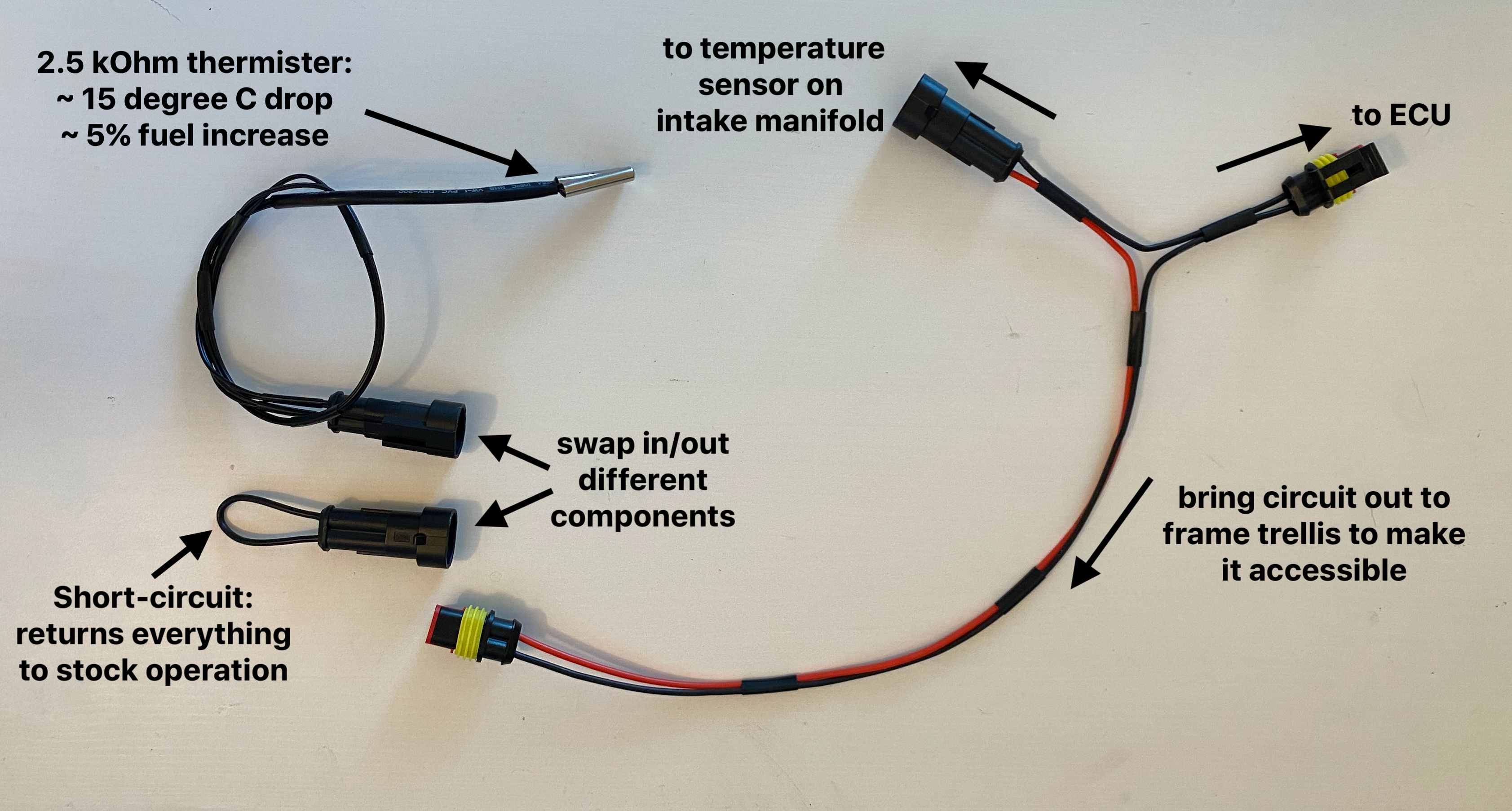 Когда есть последнее, можно например просто понять, что датчик температуры воздуха во впускном коллекторе определяет массовый заряд и его наёбка может обеднить/обогатить топливную смесь. Для мотоциклов с примитивным ECU открытого цикла (без лямбда-зонда) простейший "тюнинг" топливной карты можно сделать при помощи 1 потенциометра или пары резисторов и переключателя, например.