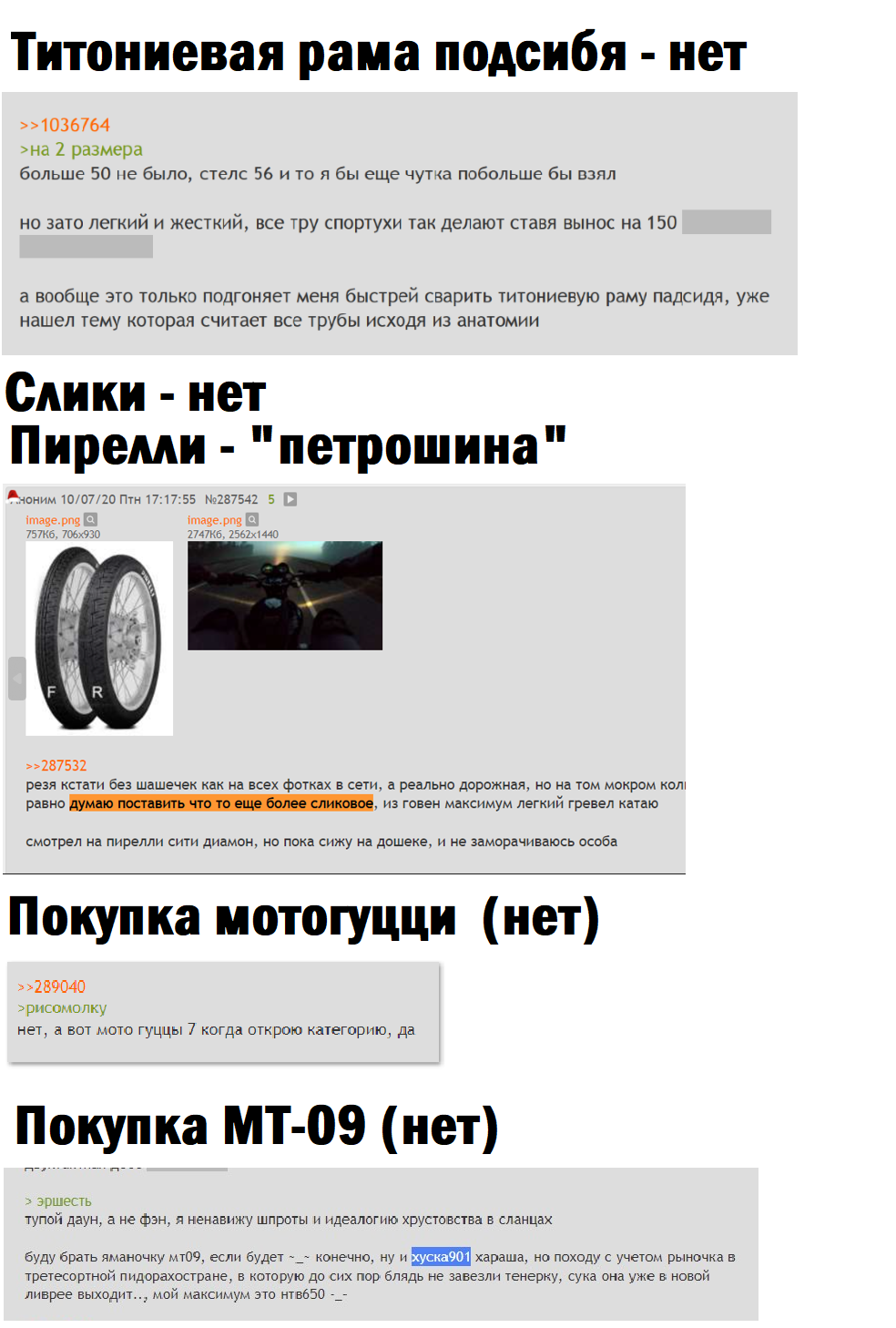>>460545 >Ответили что "нинужно" Это и есть ответ по сути. Кто ж тебе виноват, что даже главпидор ответил честно и по делу (!), но ты все равно порвался. Тюнинг мотора - последнее, что стоит делать с мотоциклом. И первое с чего начинают дауны и харлеисты.