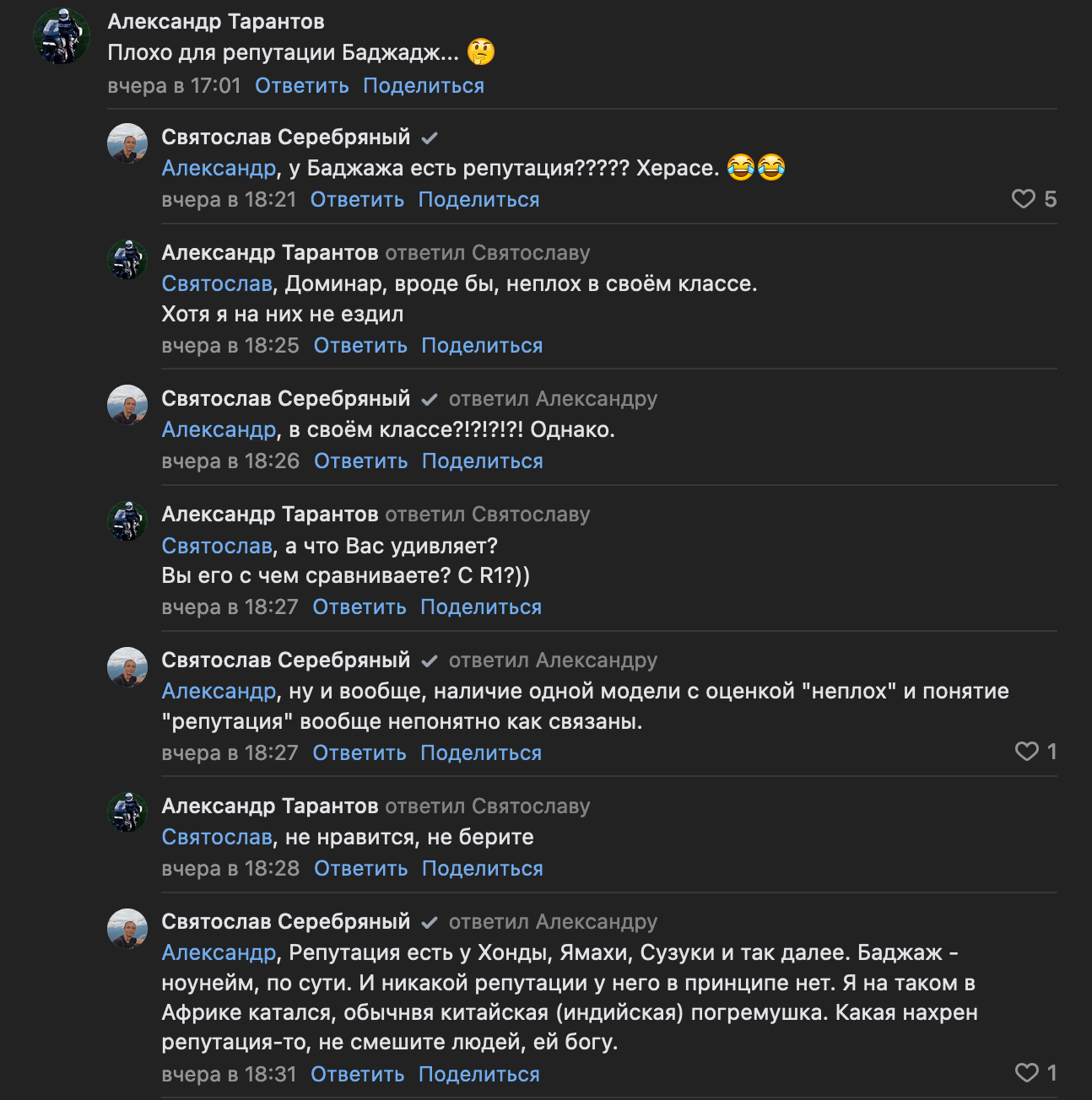 >>470368 о норм, адекватный диалог подъехал, без залуп и пидоров >Твоей драндулетке до среднего халфлитрового китайца - как до Луны, юноша. Без обид, тупа по факту Это типа какого? вог, сфмото? может они и норм по оснащению и надежности, но внешне просто как нэйкеды не мое. Из круизеров/классиков у них только Бенда как-то вывозит, судя по обзорам, но там походу резина дождь не вывозит, гулять начинает по трассе и комплект из передней-задней покрышек не соберешь, если менять захочешь. Я не то, что радикально топлю за что-то, если вижу адекватную позицию, могу на ус мотать