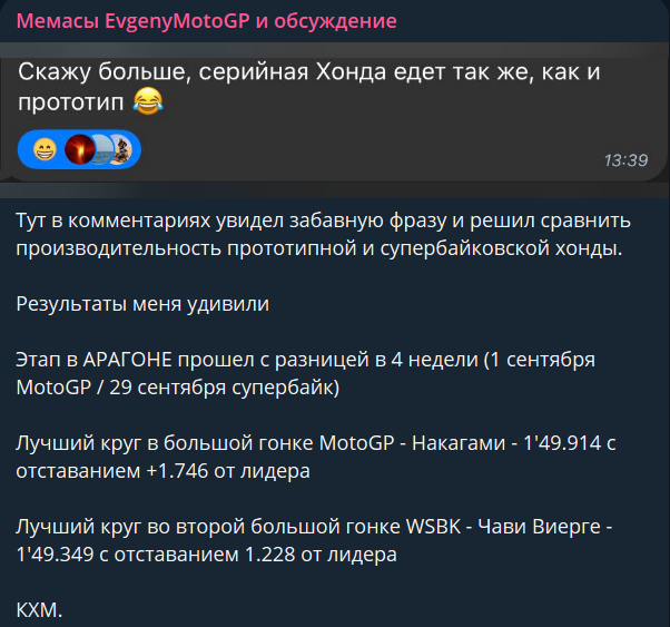 >>487133 >В хонде то блядь? Ты что с чем сравниваешь? Сузуку с топовой дукати? А при чем здесь Хонда? Речь про 2020 год, когда он стал чемпионом с одной победой >Шел весь сезон кость в кость, проебал НО ЕЗДИТ НА ГОЛОВУ ЛУЧШЕ. А в прошлом сезоне после того, как ему проехались по ногам, усложнив жизнь на несколько этапов, он поводил Мартину по губам. И что? >Там не такое разительное преимущество. Вот тогда оказалось разительным, что все отмечали >Ну это откроевенная шиза уже потекла. Ты понятия не имеешь как идёт разработка мотоцикла, но уже решил, что самый-самый лучший на голову выше всех. А это здесь вообще причем? По сути, я процитировал интервью Бани. >Сказать как я сейчас ору? Громко-громко! Спок!