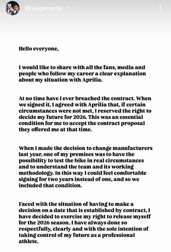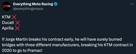 >ямаха пока гарантированно имеет 10 место в гонках. К тому же, там уже есть дорогой гонщик. Звучит где-то логично. Но не знаю, насколько Мартин дорогой был по факту на момент заключения с Априлией - тогда он еще не был чемпионом, да еще и кумом низкобюджетного Алеиша. Алсо, у Априлии денег и так нет, Ди Джио тоже не за копейку наверняка, а теперь еще и саттелитная команда запилилась.