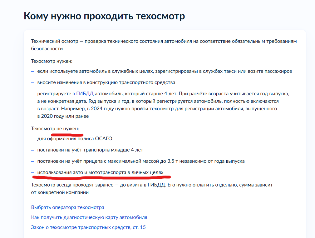 >>475104 >>7. Легковые автомобили и мототранспортные средства, принадлежащие на праве собственности физическим лицам и используемые ими исключительно в личных целях, не связанных с иной деятельностью, в том числе с предоставлением услуг по перевозке пассажиров и багажа легковым такси, осуществлением перевозок пассажиров, использованием личного транспорта в служебных целях, не подлежат техническому осмотру