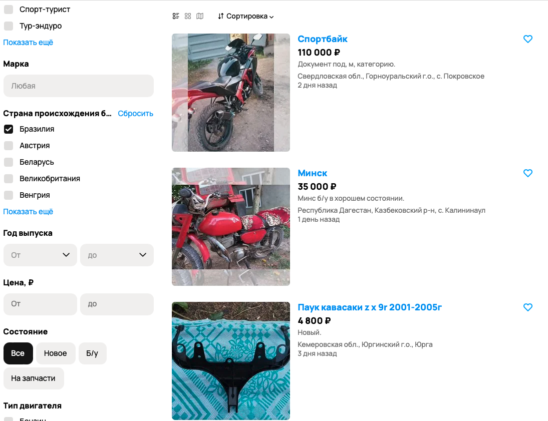 >>484481 В каком сценарии? У нас на всех платформах фильтр по моделям в числе первых идет... >>484483 Принято. На самом деле фильтр по стране происхождения бренда есть, но он сейчас не очень удобный – там все страны по алфавиту указаны их их слишком дохрена. Думаю, вынесем самые частотные наверх, а всякую мелочь сгруппирую. >>484516 Сам фильтр работает. Просто сами мотики размещены в неправильных категориях. С Минсками часто такая тема. Видимо, юзеры ищут марку "Минск", не находят (у нас в базе производитель Минска – ММВЗ) и тыкают в рандомную марку-модель. >>484564 Понимаю твою боль, анон, но мотозапчасти не моя тема.
