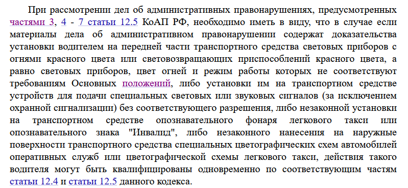 Есть разъяснение ВС - тоже об установке на ТС: "Например, такие приборы или приспособления могут быть установлены на переднем бампере, под решеткой радиатора, под ветровым стеклом и т.п."