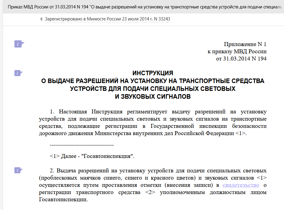 Наконец есть приказ МВД, который регулирует установку на ТС световых И звуковых сигналов (проблесковый маячок + сирена).