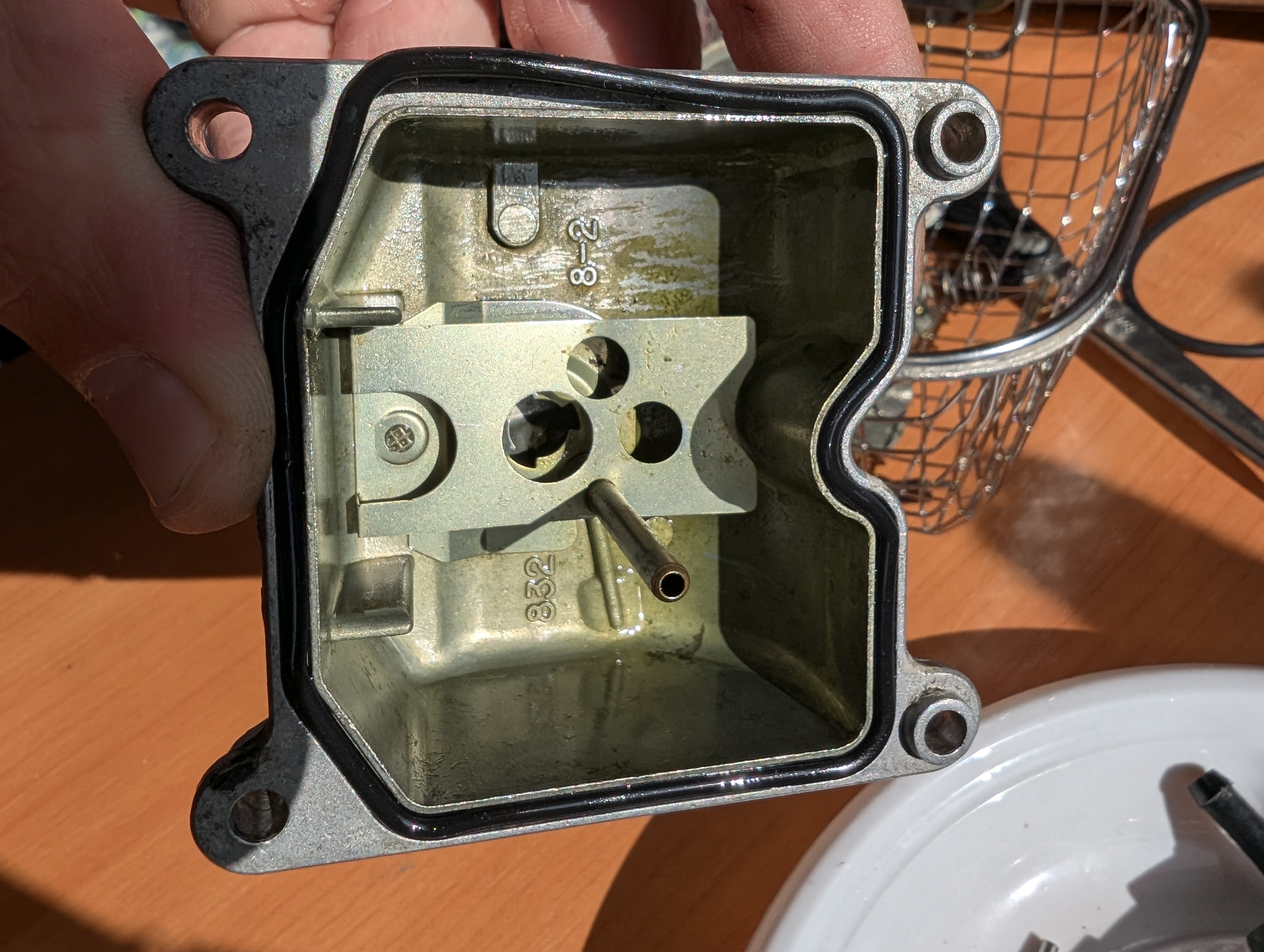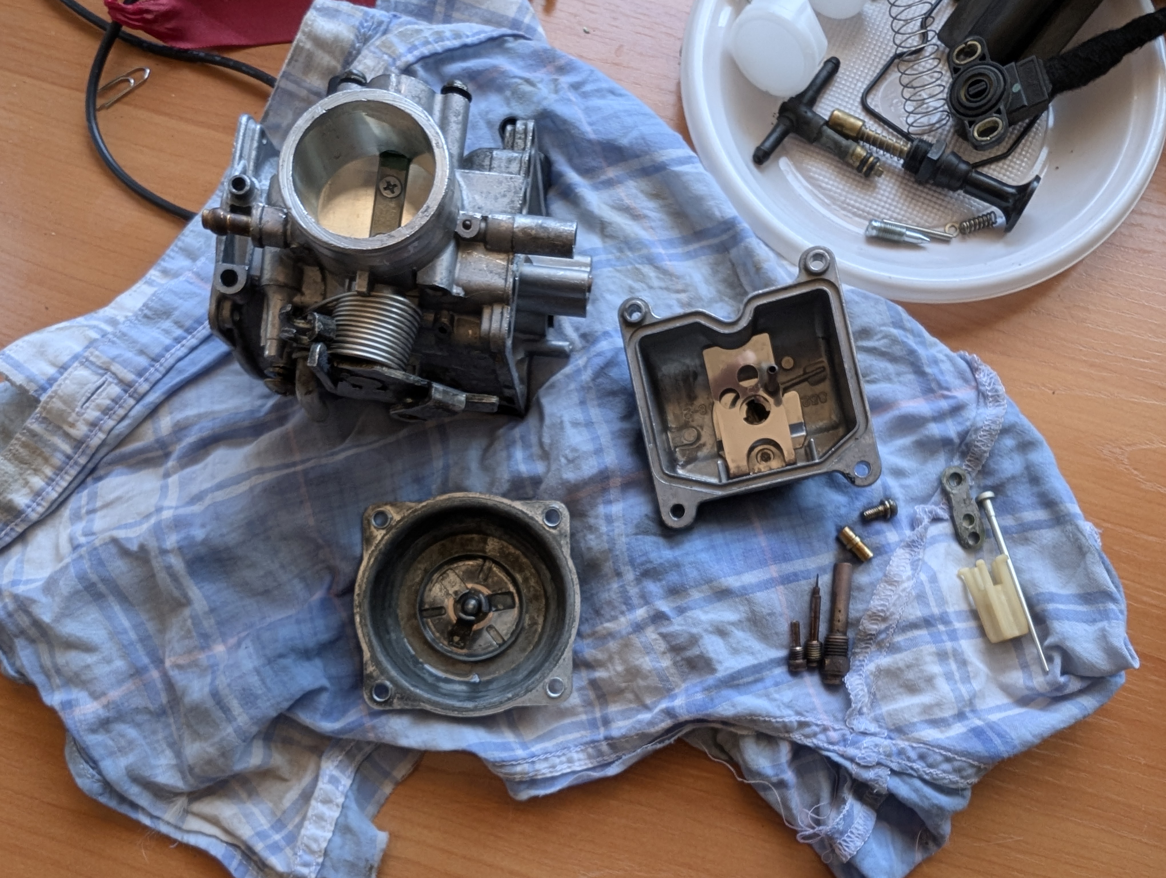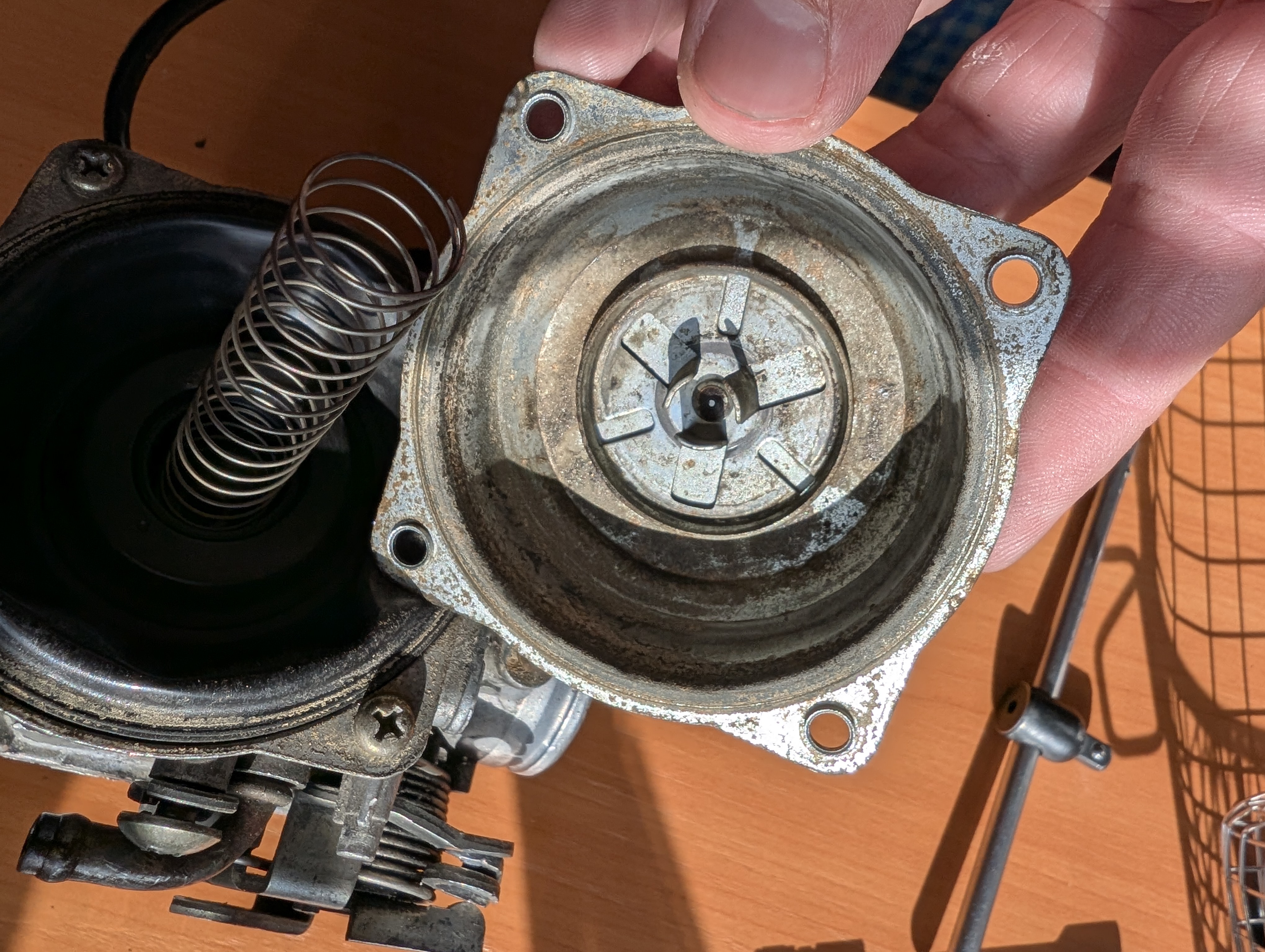 Я disassembled курбулятор. Там засрано, особенно где мембрана, да и вообще везде. Для успешного разбора пришлось изготовить спец отвёртку путем стачивания излишков у обычной, чтобы добраться до idle jet, алсо, понадобилось сходить в магазин и купить набор инструментов, которые типа форма звёздочка с дыркой, дабы открутить болты у датчика дроссельной заслонки. Ну короче разобрал, что разбирается и загрузил в ультрасоник ванну, но жду химию, которая должна завтра прийти, тогда и посмотрю, насколько это оверрейтед шайтан машина или годнота.