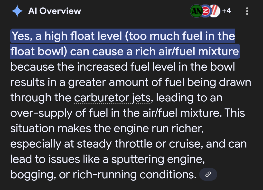 >>507357 Щас быстро обратился к гуголу -- судя по свече, у меня слишком богатая смесь и быстрый ai ответ грит, что слишком высокий уровень поплавка может вызывать такое. В общем думаю план действий такой тогда: 1) Пофиксить перелив и посмотреть на результат 2) Если будет так же плохо, то... Искать новую иглу? Jet needle то не регулируемый, по крайней мере тот, что сейчас стоит. Да и вообще вроде у всех CVK карбов по умолчанию такие.