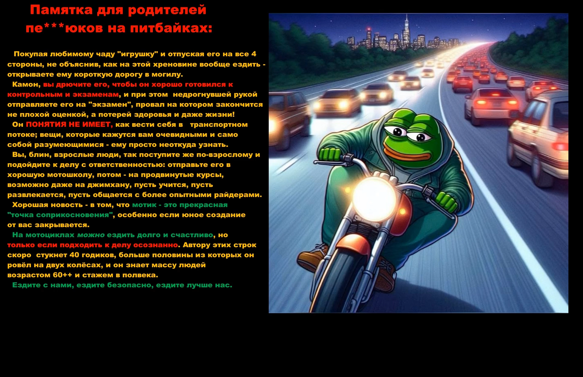 >>513561 >Воспитывать надо было раньше, а в 10 лет ребёнку держитесь за жопы, дальше будет веселее. Бля, это логика из серии "горит сарай - гори и хата". Ну давайте тогда забьём хуй на всё, раз пездюк топнул ножкой - давайте подарим ему питбайк в 10, потом литровый джиксер в 14, потом перепишем на него квартиру, чтобы он мог её продать и спустить всё бабло на геншин, или в какую там поеботу пориджи шпилятся сегодня. >А всё проще - в компании таких же олигофренов найдётся один, а то и несколько школоло, которые выклянчили себе колёса. Понятное дело безлошадные дружбаны попросят прокатиться Лично я не имажинирую 14-16-летнего олигофрена, который доверит свой моточек 10-летнему соплежую. Я просто нарочно пытаюсь представить такого конча и у меня не получается. Даже в легендарном видриле поцыку было лет 13 минимум. >или будут пассажирами (без шлемов 100%) А вот это пиздос и хз как это контрить. Сразу знакомить с нормальными мужиками, а не пускать всё на самотёк. В идеале - самому подавать пример, но ОП, я так понимаю, к моторсайклам отношения не имеет. >компания школоло по несчастью вскладчину ну или пиздит денег у родителей берёт нечто, отдалённо напоминающее мотоцикл Ты серьёзно? В 10 лет такой мув никакая школота исполнить не в состоянии. И в 12 тоже. И даже если им хватит самоорганизации не просрать весь кэш и договориться, хуй им кто чего продаст в 10-12 лет, ну камон. В 15-16 - ещё может быть, но там уже и мозги какие-то появляться должны по идее. Типа, нельзя сувать писю в писю и прочие отверстия без резинки, кататься зацепером, постить неумные вещи в интернетах и вот это всё. >>513524 Слушай, ну если там пидорашье ккккомбо, где с одной стороны - пездюк, который привык всего в жизни добиваться истериками и топотанием ножками, а с другой - родители-похуисты, которыми чадо вытирает пол и которым потратьтся на эквип и нормальную подготовку пездюка - более впадлу, чем на его же похороны, то при таком раскладе просто не может быть хэппи-энда.