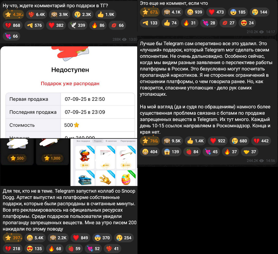 В статьях отмечают, что с2022 года количество зарегистрированных преступлений, совершенных сиспользованием Telegram, превысило 153 тысячи. Изних 33 тысячи— преступления диверсионно-террористической иэкстремистской направленности. Втом числе— теракт в«Крокус Сити Холле», атакже убийства Дарьи Дугиной игенерала Игоря Кириллова.