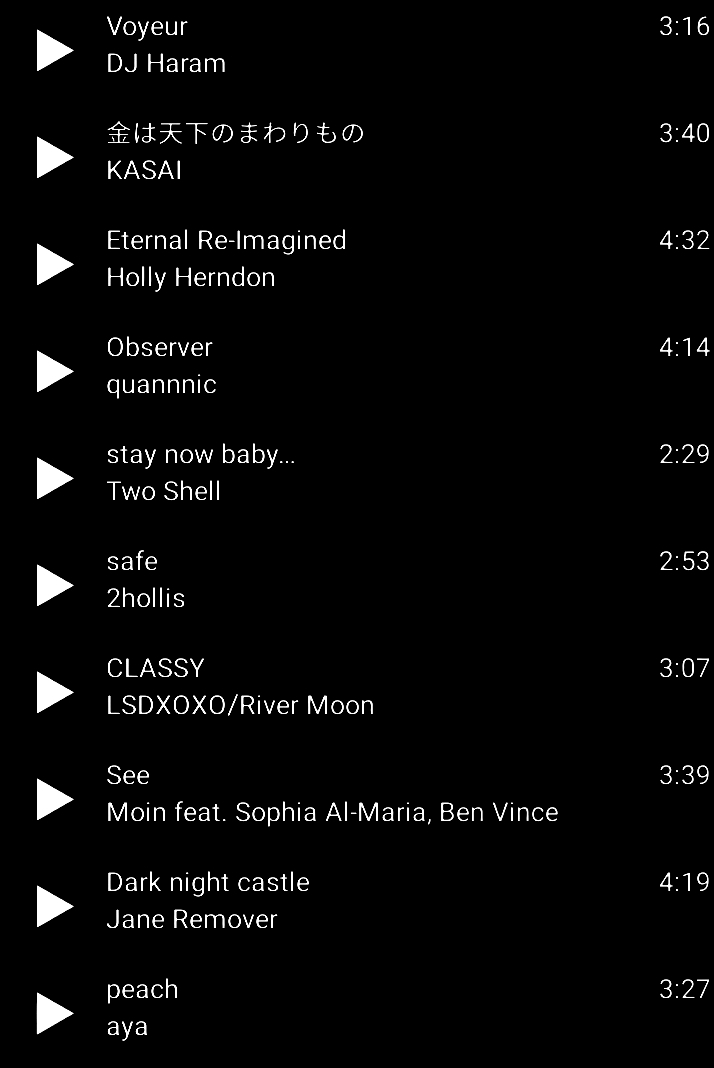 varg2tm, yeule, shadow wizard money gang, 2k88, eartheather, two shell, alexander panos, horsegiirl, fka twigs, loraine james, john glacier, lsdxoxo, audry, dj travella, tamanaramen, dj elmoe, nova varnrable, moin, Abdullah Miniawy, nidia, th blisks, astrid sonne, jun suzuki, Raär, KOKOKO!, curta n wall
