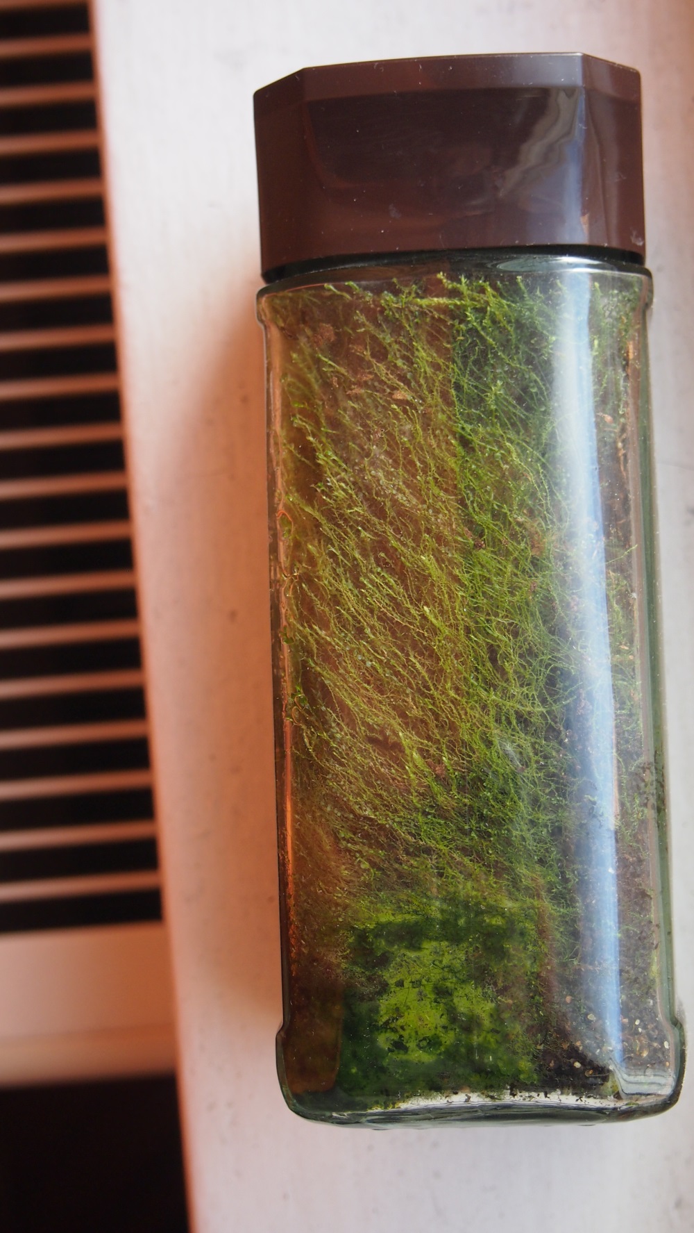 В банке от кофе никаких изменений. Мох занял всё пространство, водоросли ждут солнечных дней, чтобы продолжить экспансию. Разве что, появились довольно большие "пузыри" на передней стенке банки, где водоросли отходят от стекла. Из животных видно только мелких беловатых червячков, меньше миллиметра размером. Большой дождевой червяк не то прячется, не то сдох.