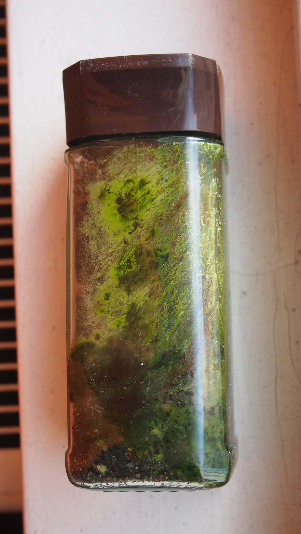5) Водоросли. Попадают в банку практически гарантированно. А потом приживаются там, где есть вода. А воды больше всего в виде конденсата на стенках. Постепенно водоросли продвигаются вверх. Это уменьшает количество света, попадающего в банку и затрудняет наблюдение. Хорошо бы найти животину, которая сможет выжить в банке и будет поедать эти водоросли. Может улитки? У меня одна ползает по стенкам банки, оставляя чистые следы. Но ест она их, или только убирает с дороги, пока не понятно.
