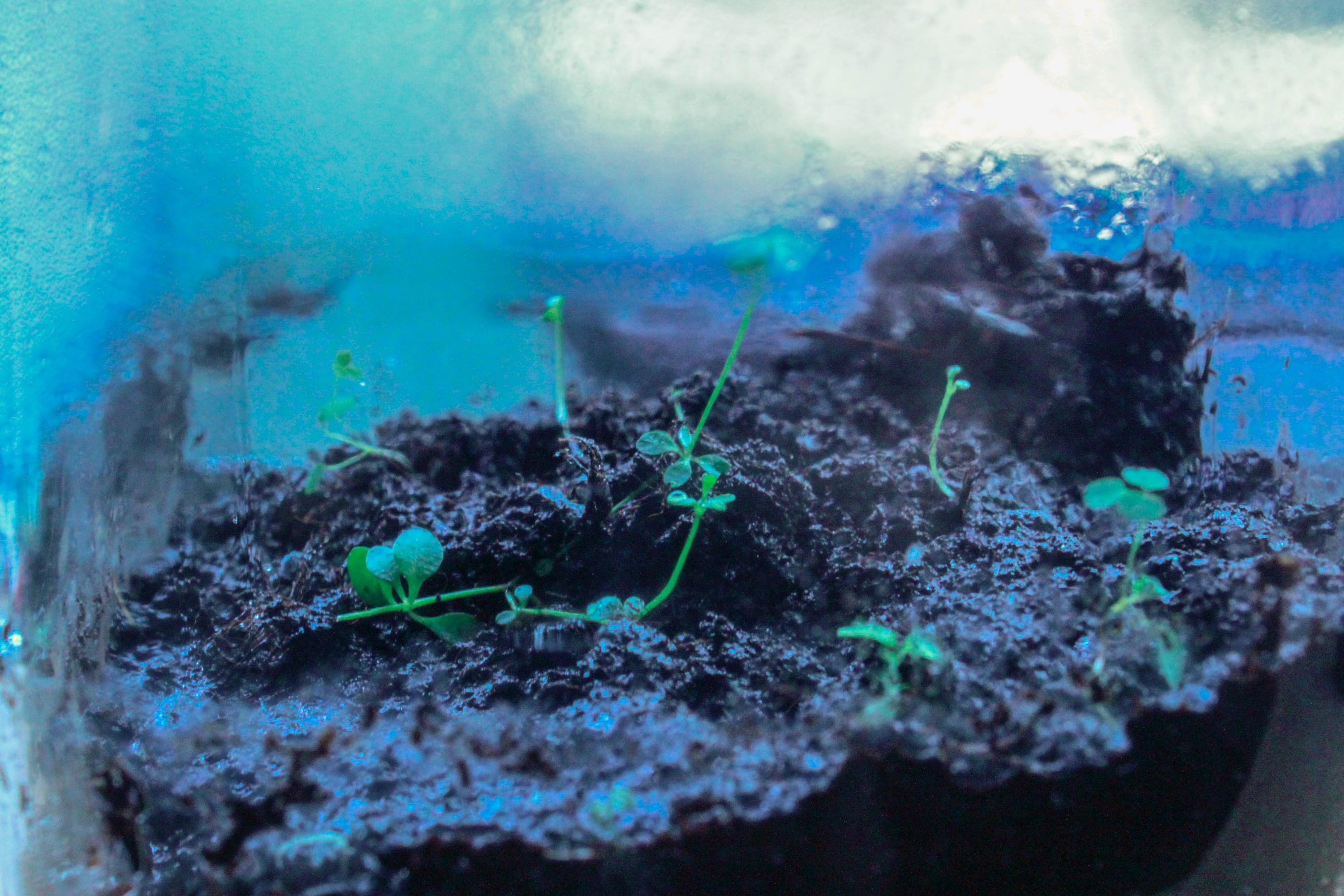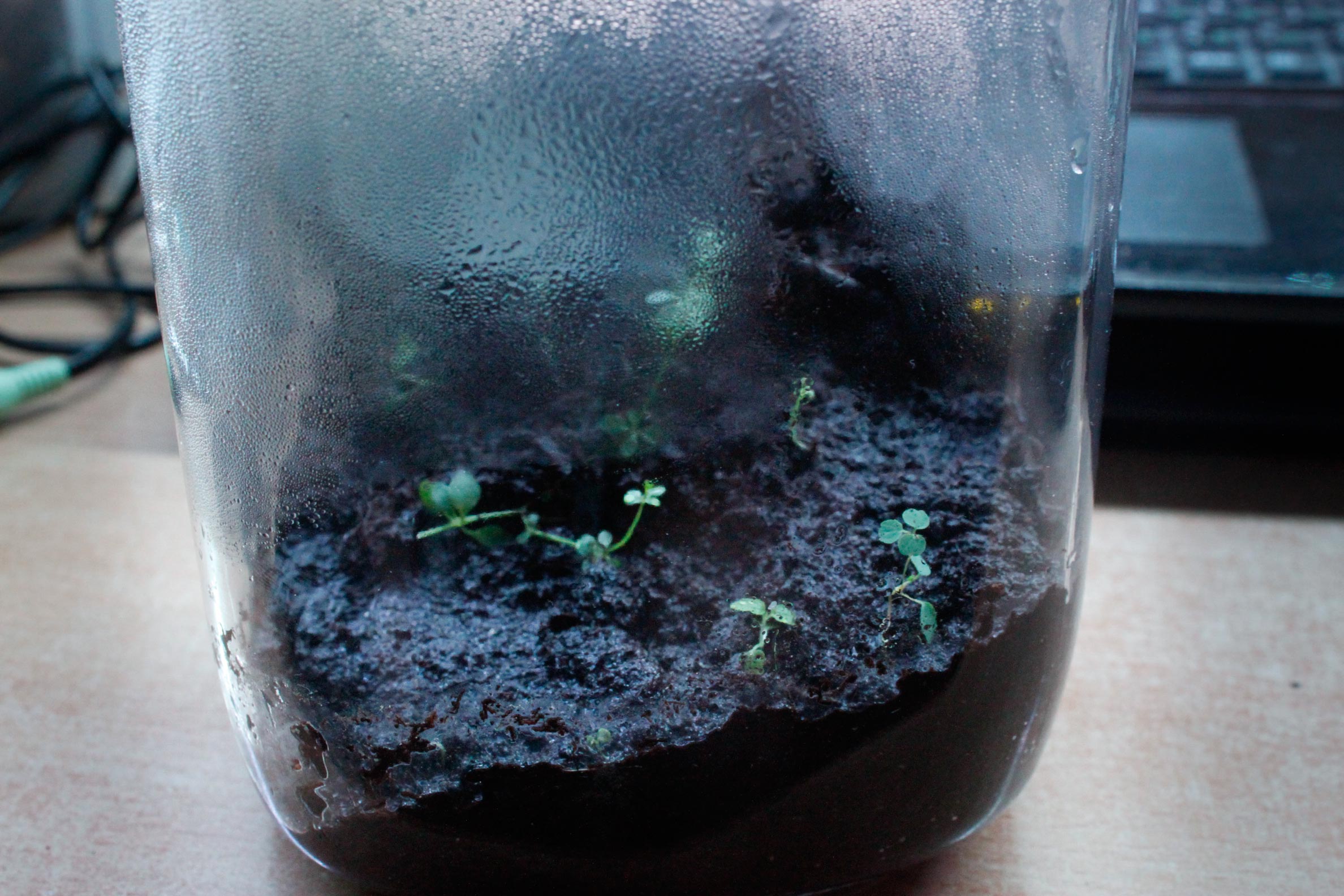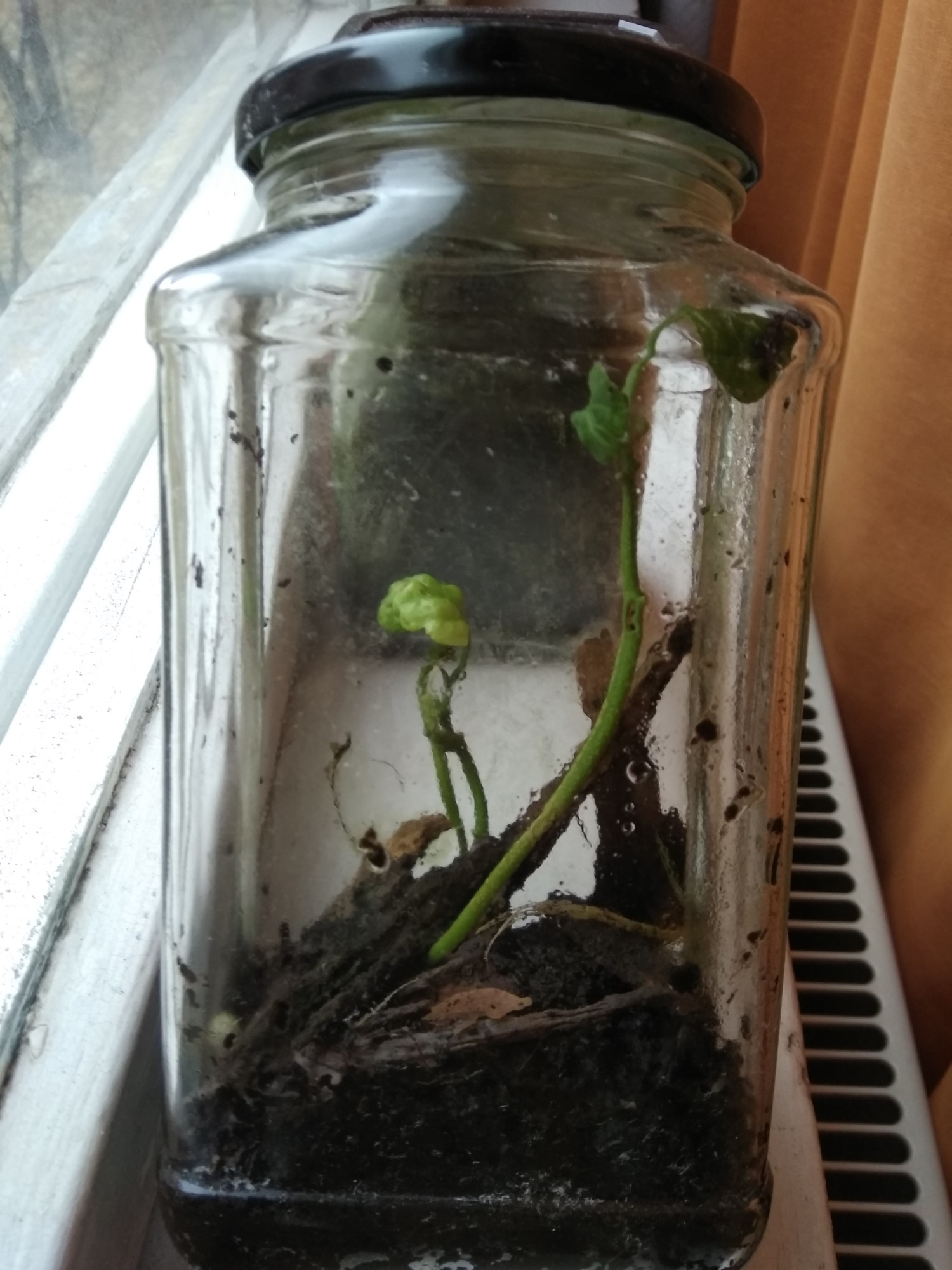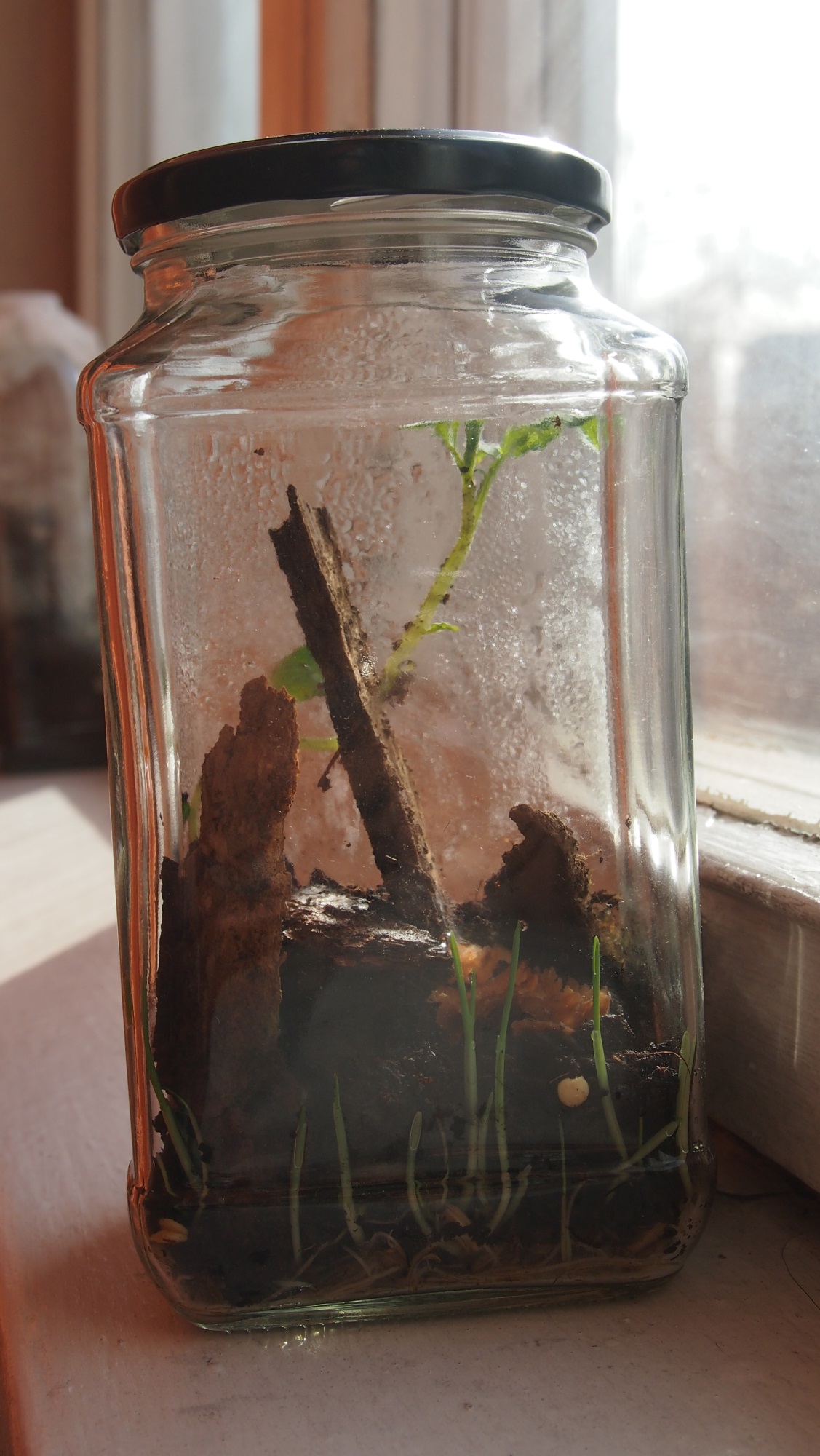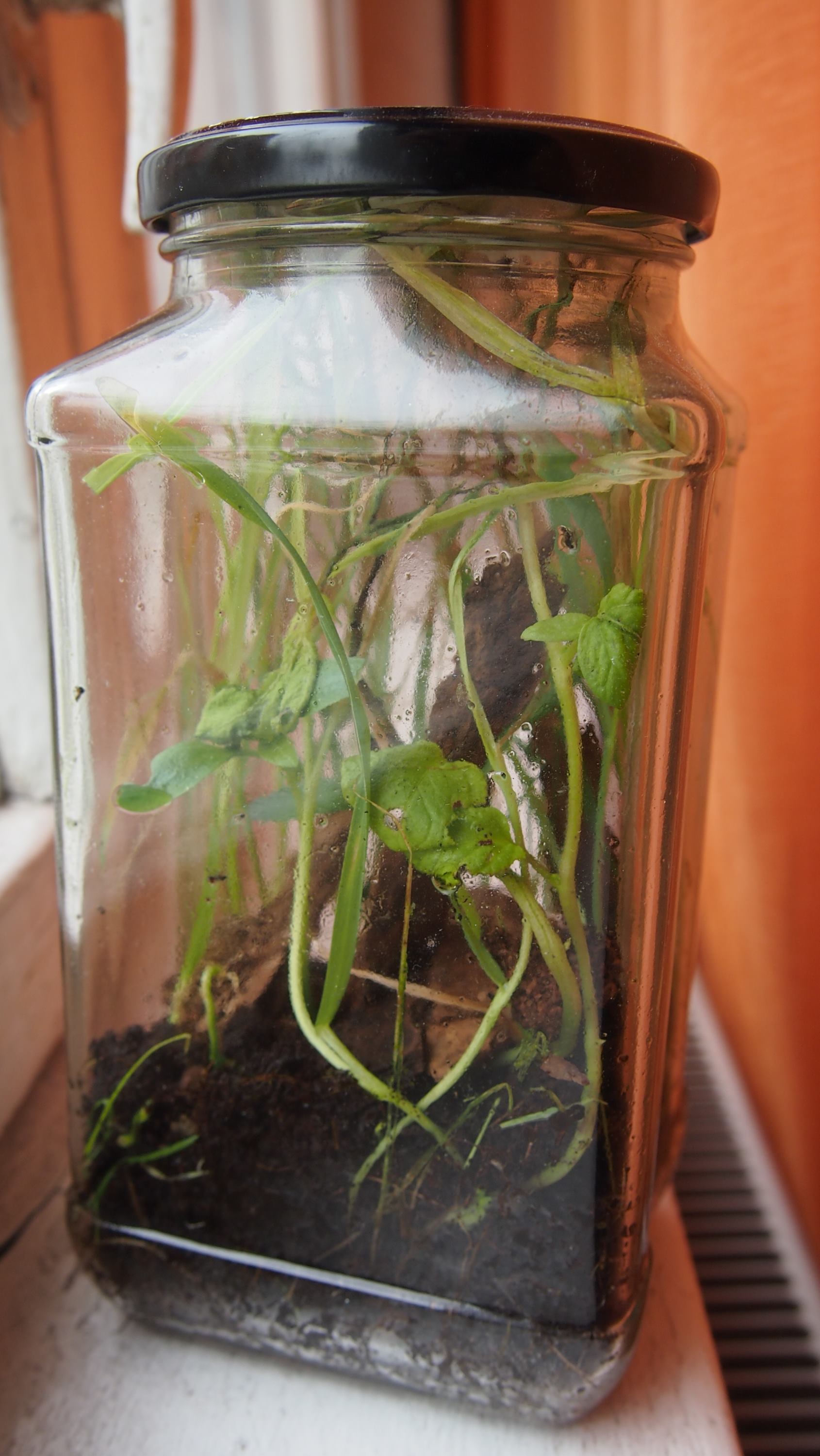Поставил на подоконник, в то место, на которое не светят прямые солнечные лучи. Это всё ещё 5 марта было. Пока что полёт нормальный. Картопля зеленеет, мокрицы хоронятся в складках местности, червяк иногда виден через стекло (но тоже предпочитает закапываться глубоко в грунт). Много конденсата. По вечерам я открываю банку, чтобы она дышала. Но только под личным приглядом, чтобы никто не убежал из неё. Надо бы какую-нибудь марлевую крышку соорудить, что ли. Некоторые семена уже проклюнулись. А ещё сегодня накидал туда семечек от сладкого красного перца. И собираюсь и дальше засевать всякими растениями. А потом, когда более-менее зарастёт, попробовать запустить слизней или улиток. Жутко интересно, смогут ли они в итоге создать устойчивую связь, или тупо сожрут все растения и сами передохнут от голода.