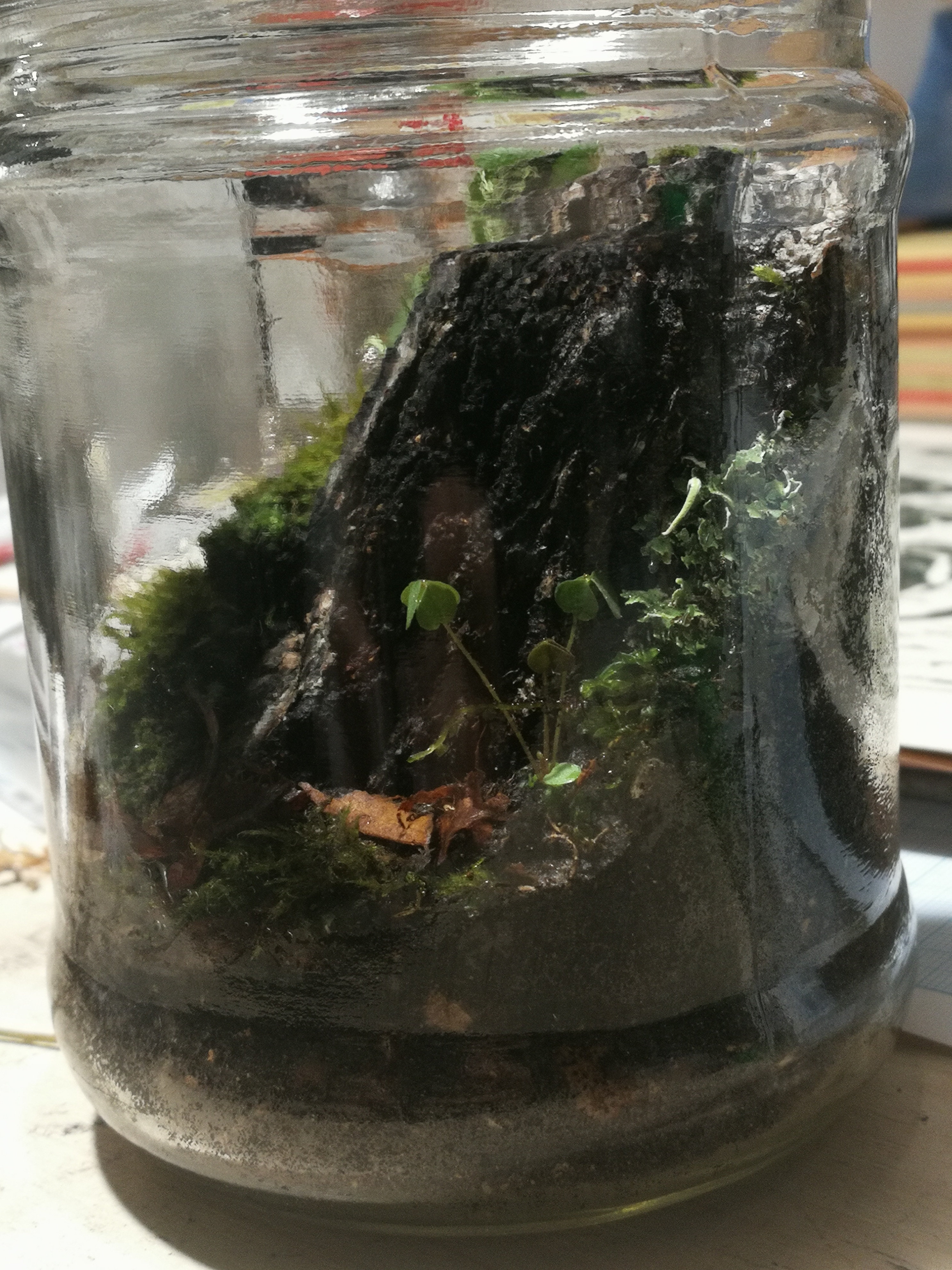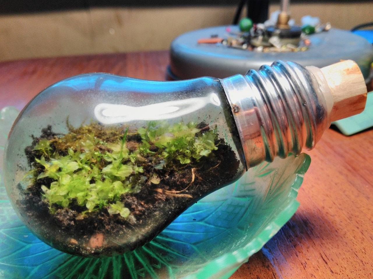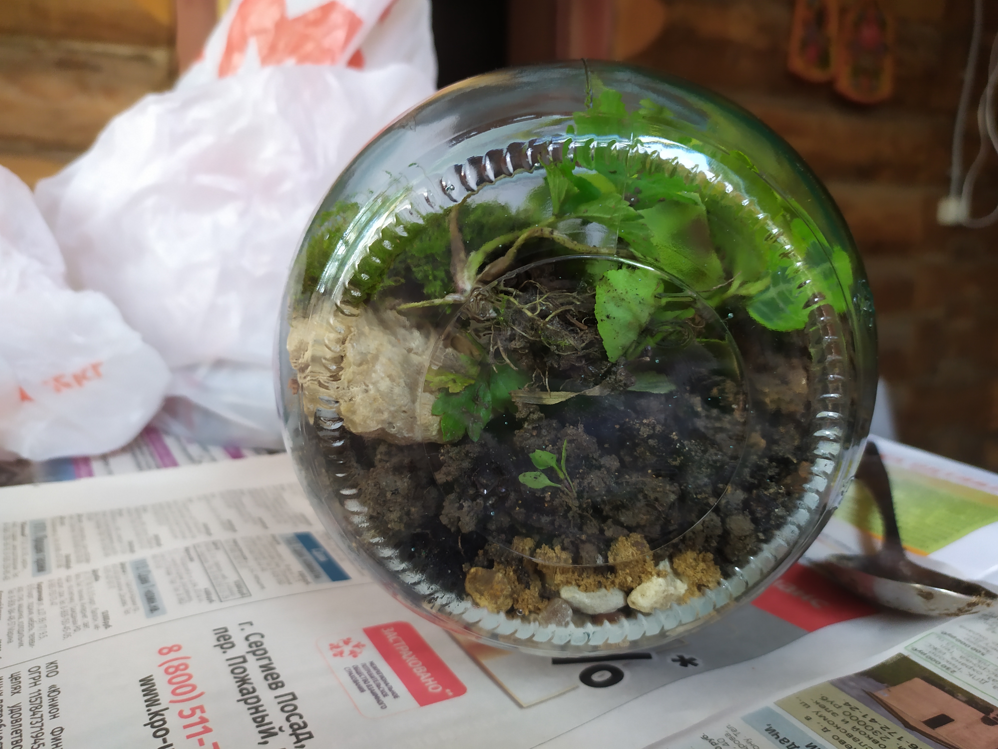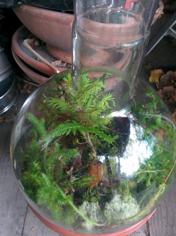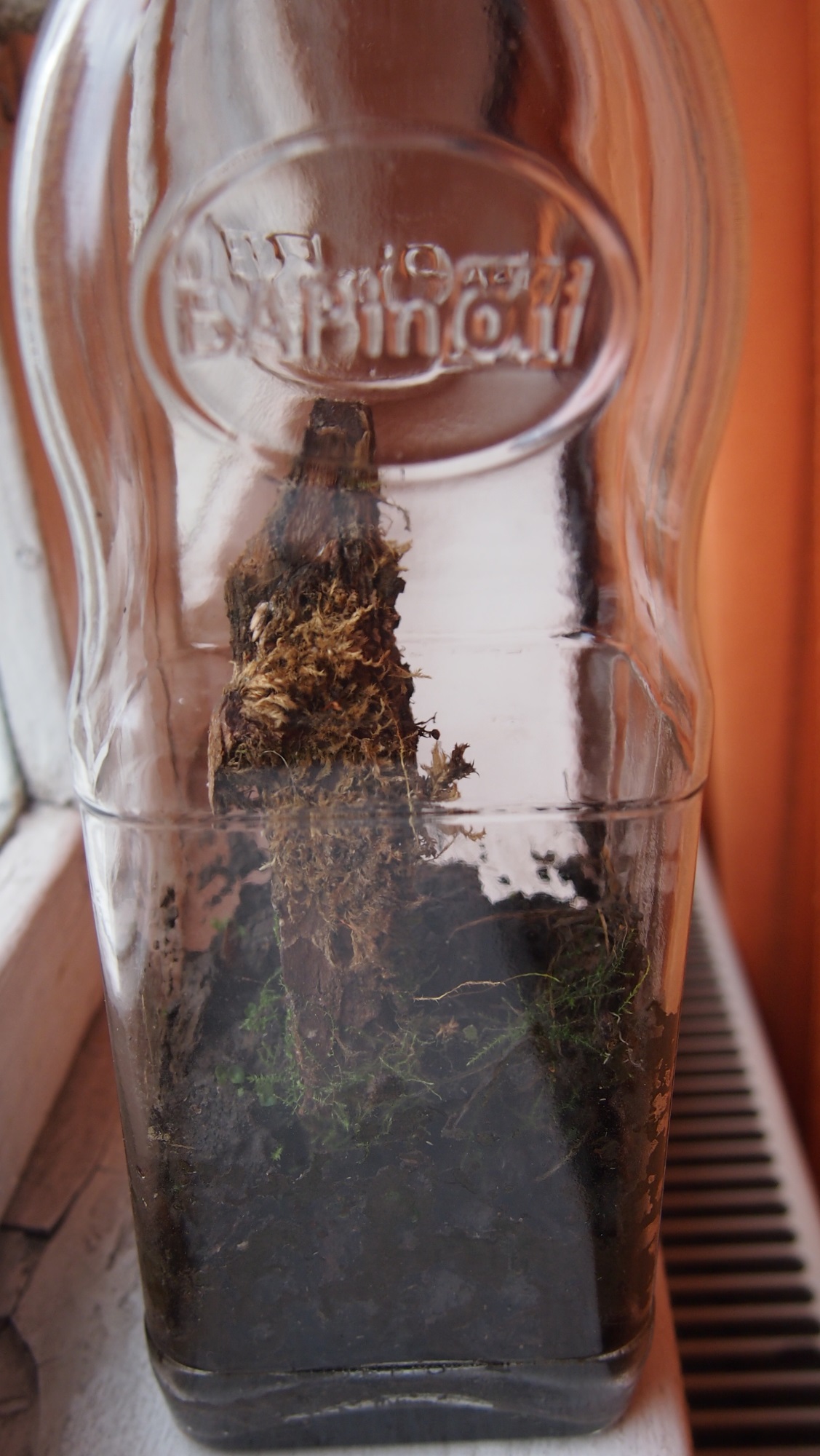 Сделал ребенку на окруж мир в бутылке из под Стратислы 1L. Посадил: камушки, песочек с опилками, мох от коры, просто мох (какой-то другой), кору со мхом и маленький клевер. Вместе с корой попались мокрицы в кол-ве 4 шт. Всё залепил термоклеем. Повесил бирку с назиданием: "Не переворачивать". Хрен с этими мокрицами - сожрут что-то хорошее - им же хуже. Старался соблюсти основные правила: фотосинтез - мох и прочие днищевые растения, дренаж, кора дерева и НЕ ПЕРЕБАРЩИВАТЬ с водой. Много воды - самая распространенная ошибка. И то - капнул пару капель, закрыл, а на стенках сразу пот... Хотя вроде земля была сухая.. Через пару лун вернусь.
