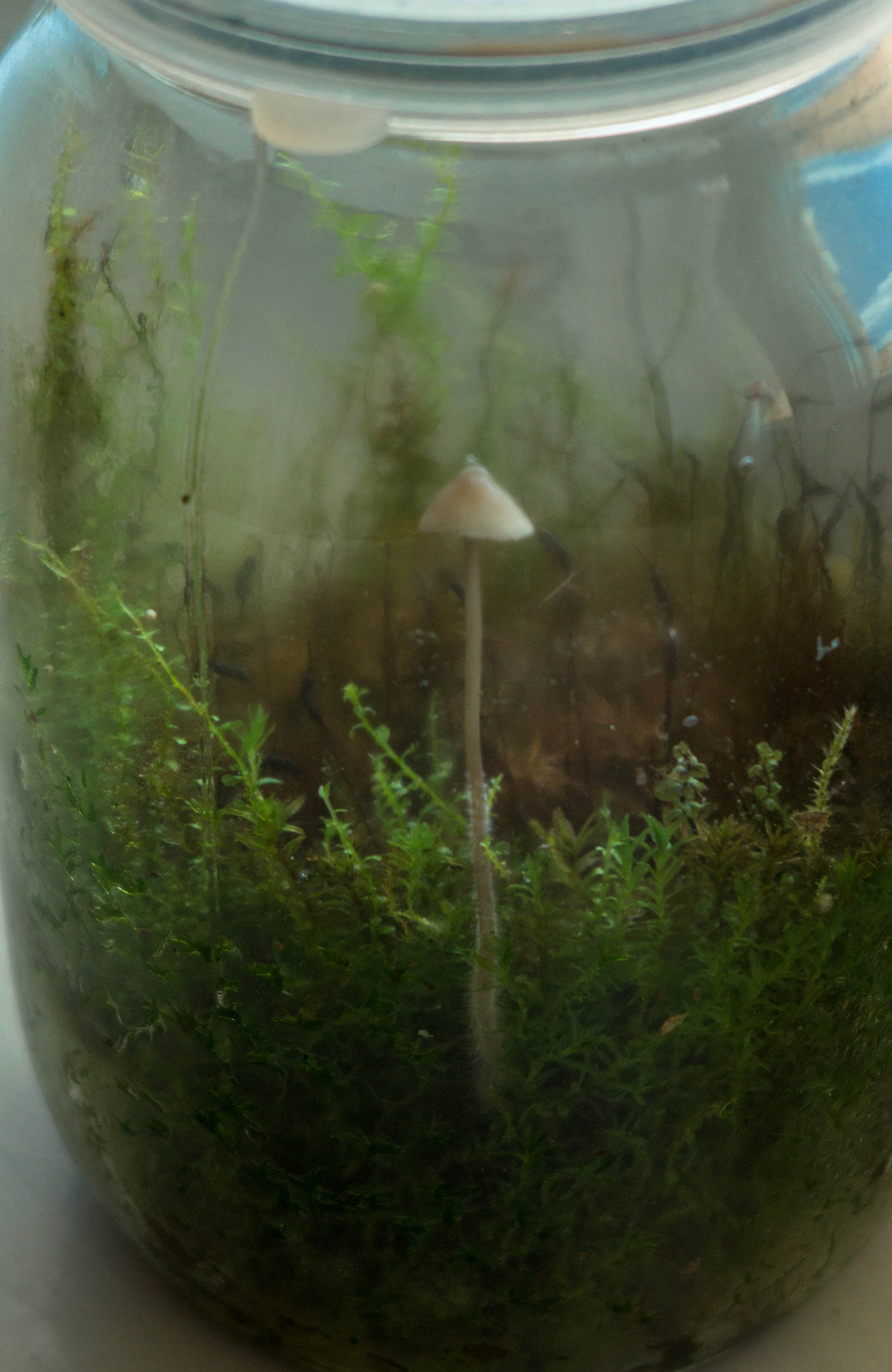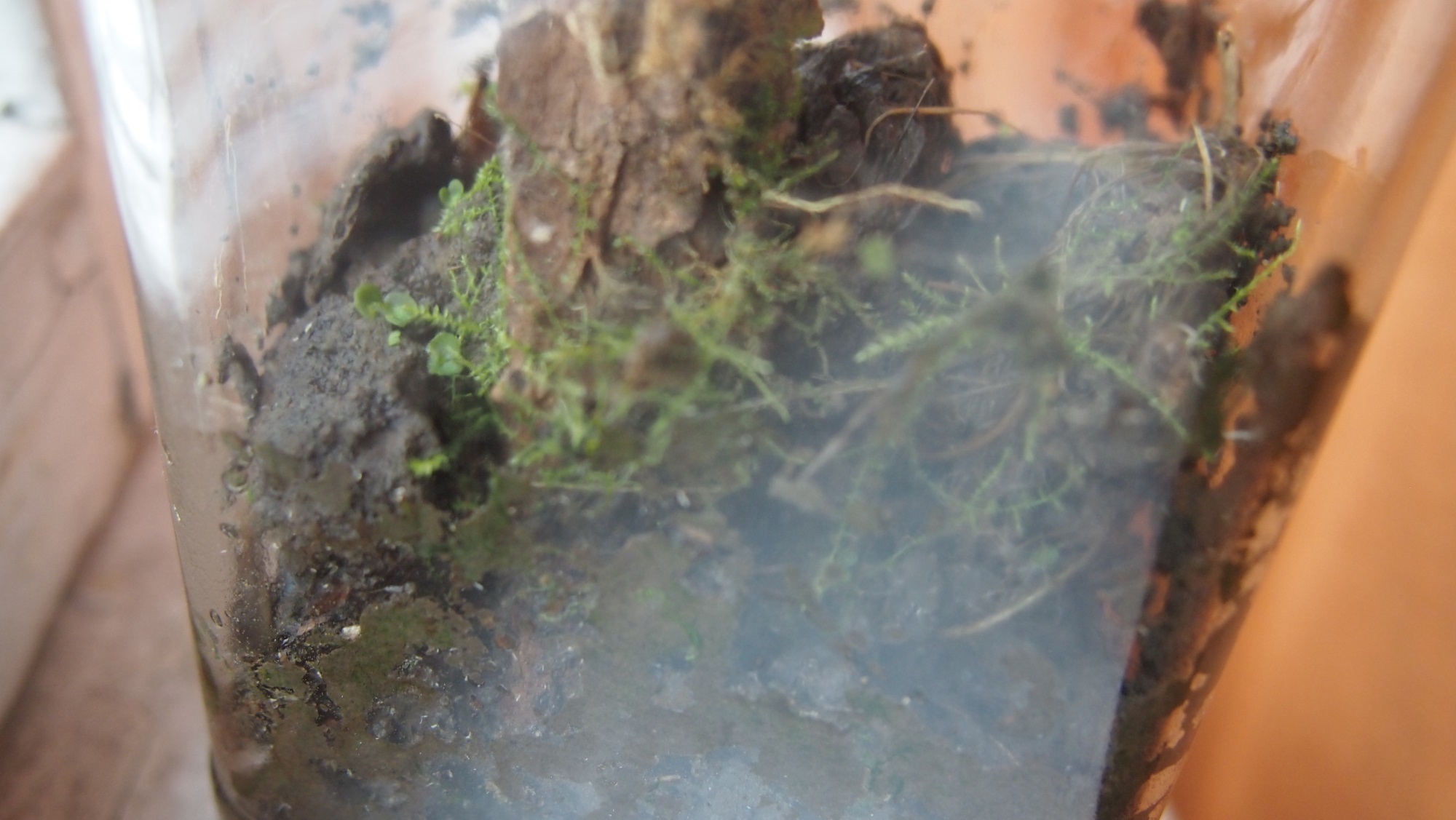 Банка за год изнутри заросла мхом и каким-то ползучими корнями, показывать нечего. На стекле иногда видно живых ногохвосток, в земле ещё червие ползает. Что внутри происходит, не знаю. А вообще забавно, такой девонский период в миниатюре получился. Примитивные членистоногие, черви, мох и водоросли. Там ещё наверняка высокая температура (банка на солнце стоит), давление и высокая концентрация углекислого газа. Как думаете, что там будет через пару миллионов лет?