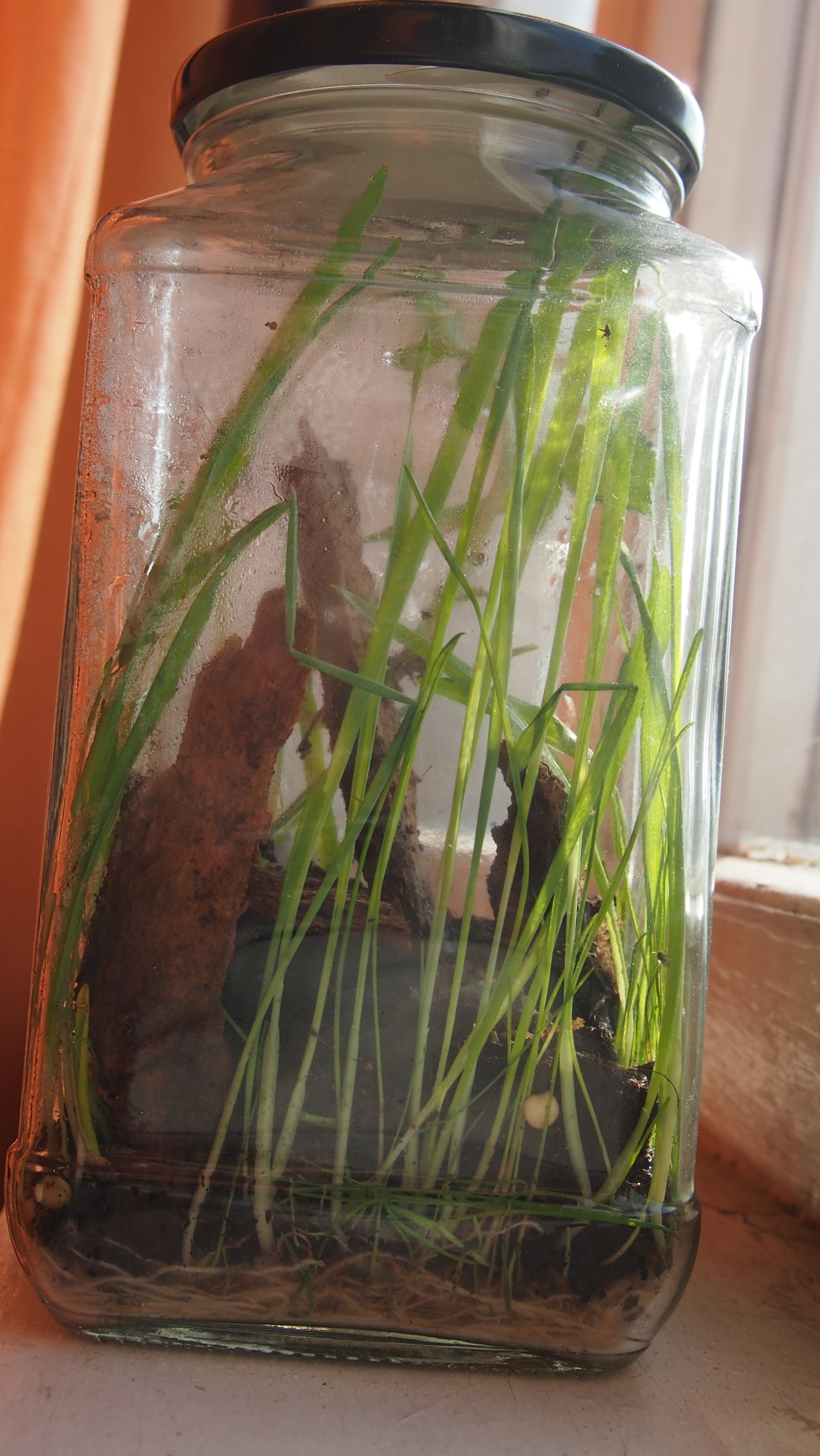 Кстати, вспомнил. В начале декабря я туда сыпанул немного зёрен овса (живых) и луговой травы. Трава не взошла, а овёс пророс и упёрся в верх банки. А потом очень быстро зачах и умер. Банка смерти какая-то.