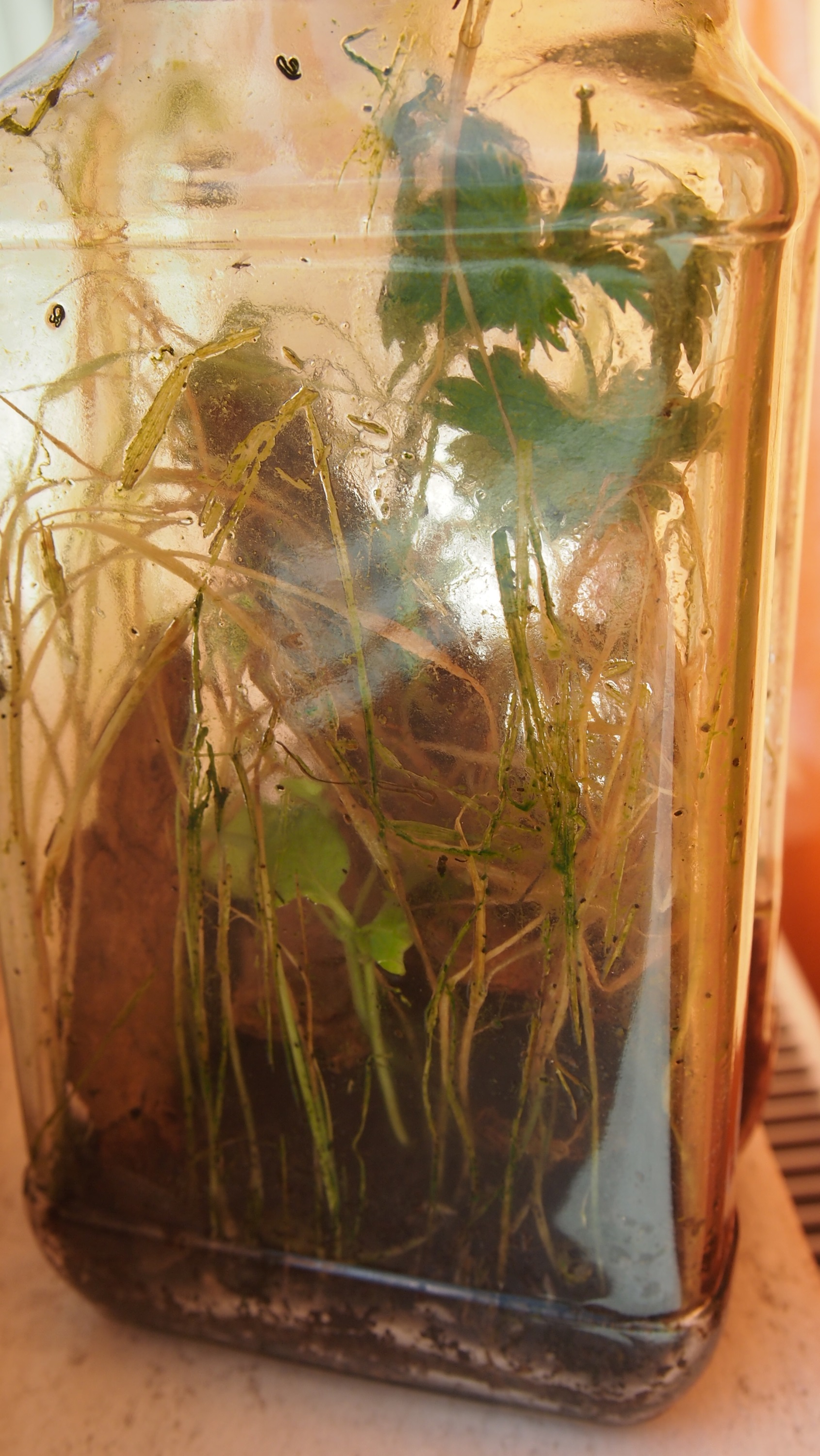С третьей банкой тоже не всё хорошо. Вся трава сгнила. Разве что, в одном месте овёс пытается отстрелить новый побег. Картофель тоже сгнил. Не знаю, почему так произошло. Сыро? Или сварились от прямых солнечных лучей? А вот перец держится. И по стенам из-за обильного конденсата повсюду размножается зелёная водоросль, делая их грязными. Ну и не только она, там ещё на стены срёт кто-то.