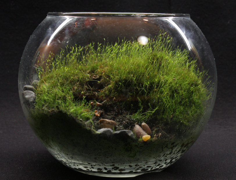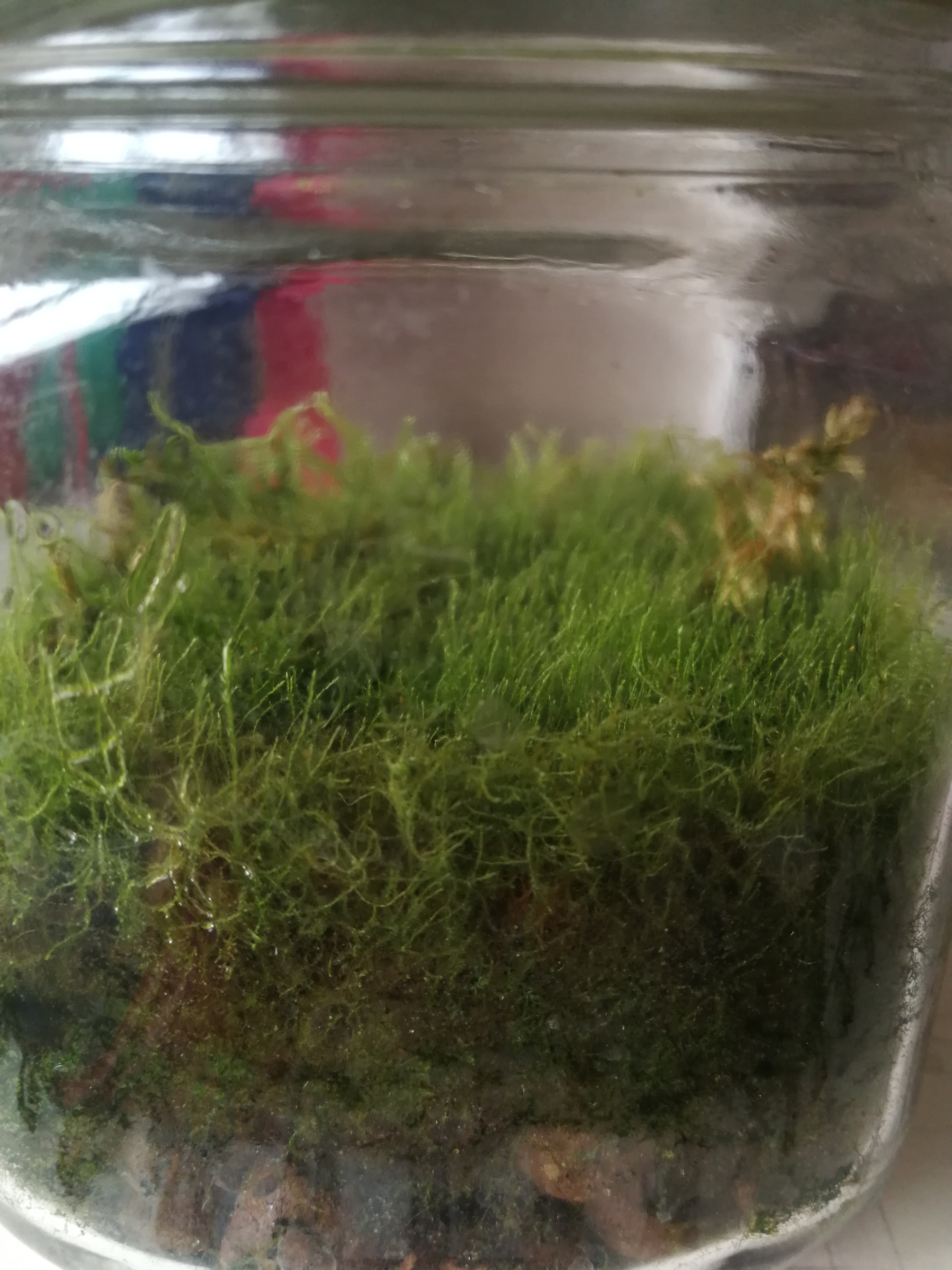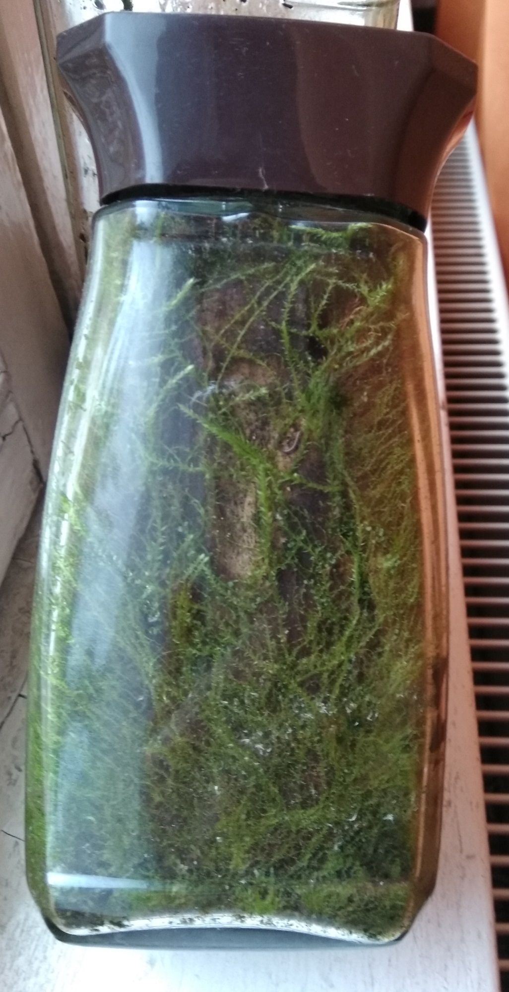 Вкачусь со своей эко-банкой. Собрал в середине сентябре, бросил на дно горсть земли, сверху - кусочек коры от старого пня, обросший зеленым мхом и еще какой-то мелочью. Специально не заселял туда живность, но предполагал что в земле и коре могут попасться чьи-нибудь яйца/личинки. В итоге так и получилось, через пару недель заметил на стенке банки маленького слизня и полупрозрачную мошку. Сейчас банке ровно 3 месяца, почти перестала запотевать. Старый мох немного потускнел, но дал новые тонкие отростки. Мошку уже с месяц не видать, видимо подохла от голода, слизняк же прекрасно себя чувствует, подъедает молодые побеги и потихоньку прибавляет в размерах.
