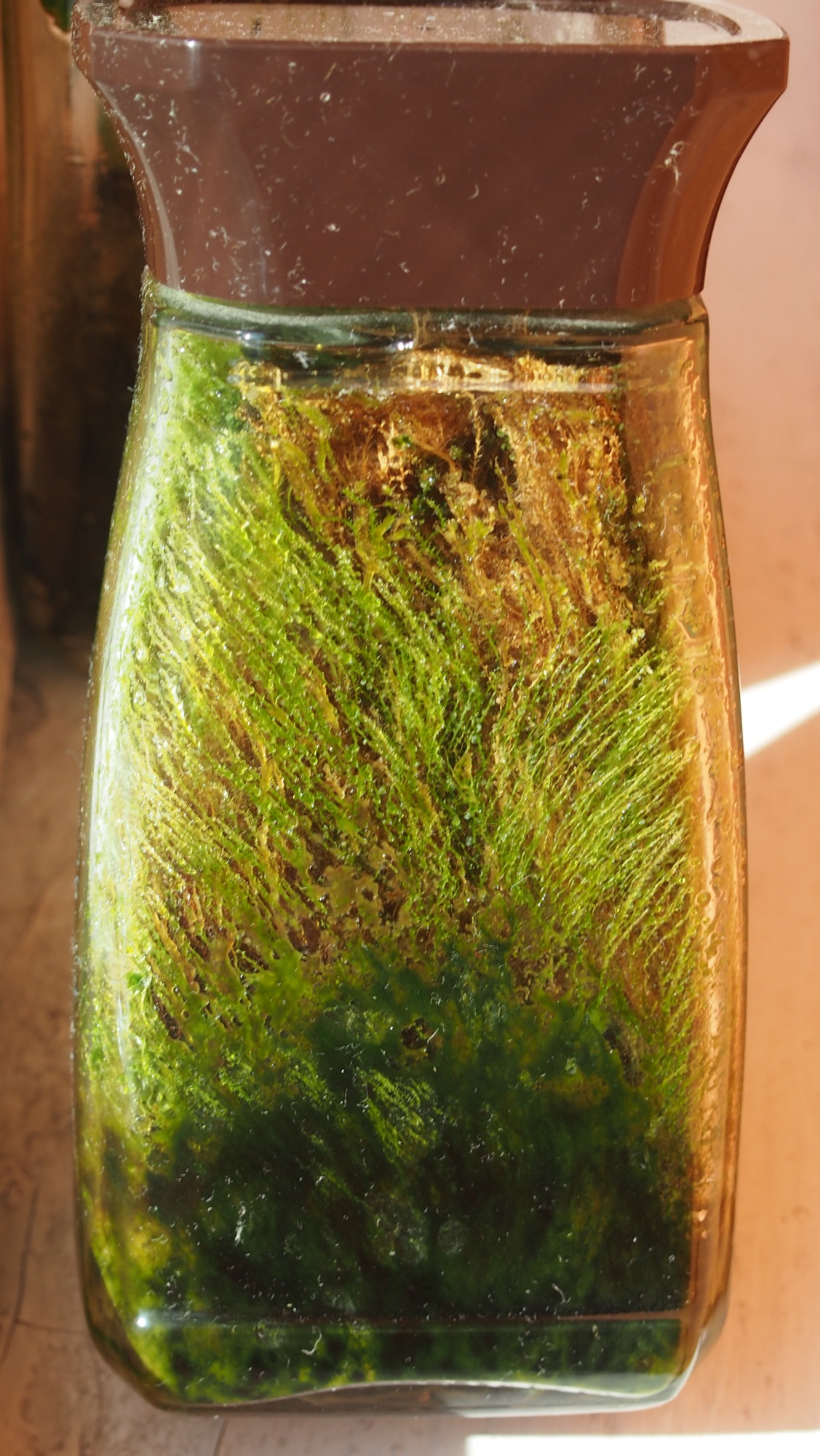13 сентября исполнилось джва года банке из под кофе. Мох там себя чувствует великолепно. Пострадавший от прямых солнечных лучей и побуревший мох отдаёт место новой поросли. Эта новая поросль захватывает все места, в том числе даже сзади, где к стеклу прилегает кусок коры. Прилегал он неплотно, вот и результат. А ещё мох отжимает поверхность банки у водорослей. Получается так: - Водоросли размножаются на стекле и выделяют кислород. - Из-за этого появляются пузыри между стеклом и слоем водорослей. - В эти пузыри заползают ростки мха. Так что вероятность полного захвата банки водорослями сильно уменьшается.