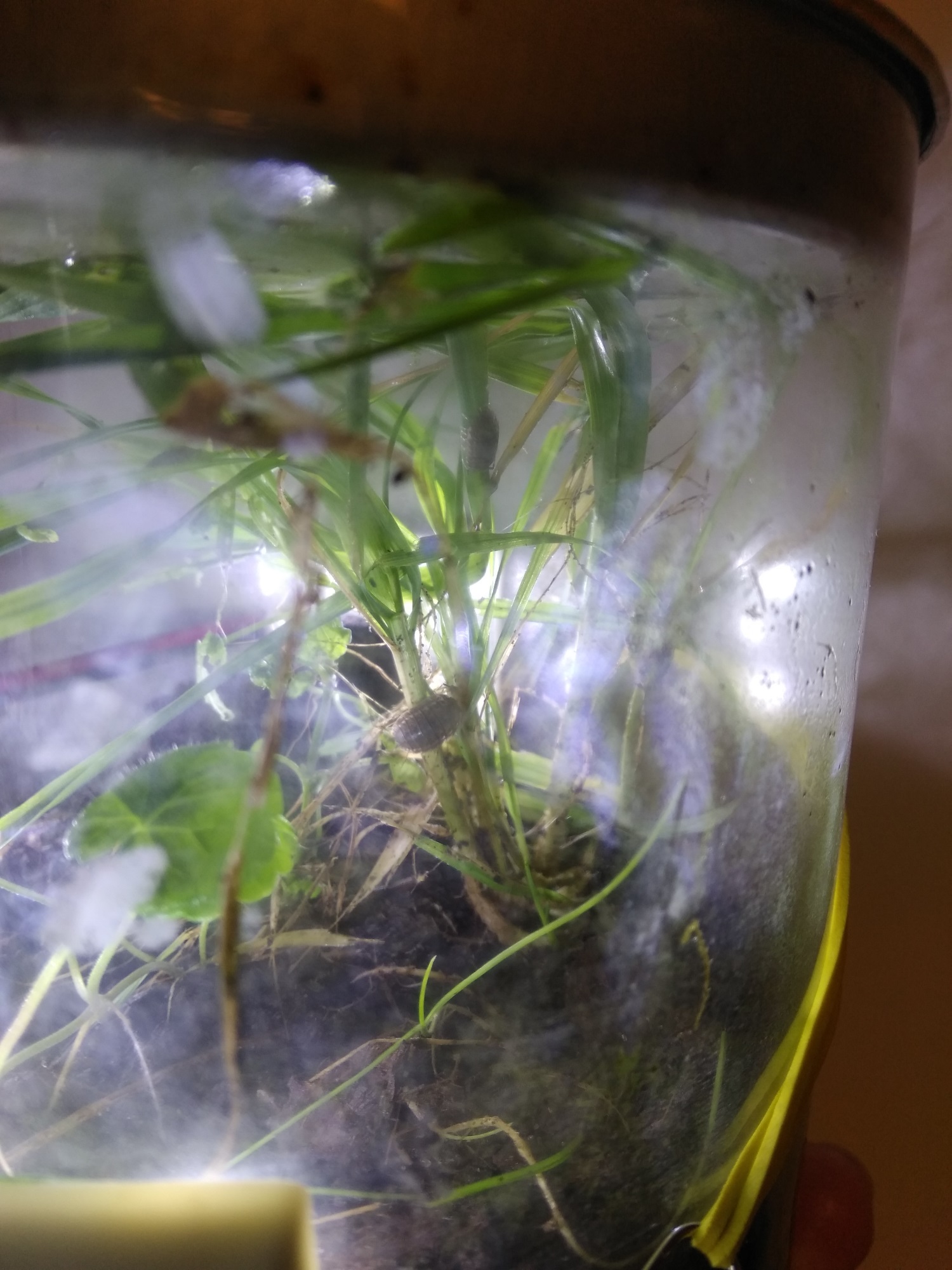 Заметил в первой банке всё тех же многоножек. Вернее, одну. Думал они уже вымерли. На фото видна по центру.