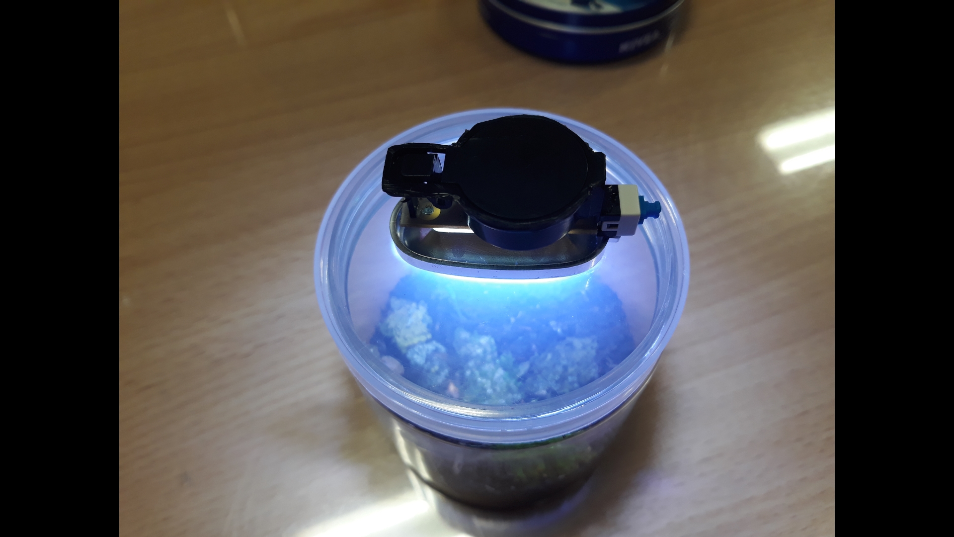 Началось всё 14 месяцев назад, когда я взял банку из под какого-то буржуйского печенья с плотной крышкой. Стенки сделаны из пластика, причём это просто лист, который свернули кольцом. Чтобы улучшить герметичность, проклеил суперклеем все стыки. И сделал большую ошибку: держал банку закрытой, пока клей сох. Из-за этого пары клея прореагировали с мельчайшими частицами жира и прочей грязи, покрывавшей стенки. На вид всё было чисто, а вот после реакции - хрен ототрёшь, въелось намертво. Поэтому стенки получились менее прозрачными (в исходном виде они были, как стекло) и на вид заляпанными. В банку засыпал земли из леса и положил мох, собранный в парке. Этот мох раньше рос на коре деревьев, но за зиму некоторые ветки попадали, вот и соскрёб. Поверх банки прикрепил три светодиодных плашки. Каждая на 5 светодиодов. Питание от 12В. Солнечного света нет вообще. На первом фото там слишком много воды, лишнюю убрал перед закрыванием.