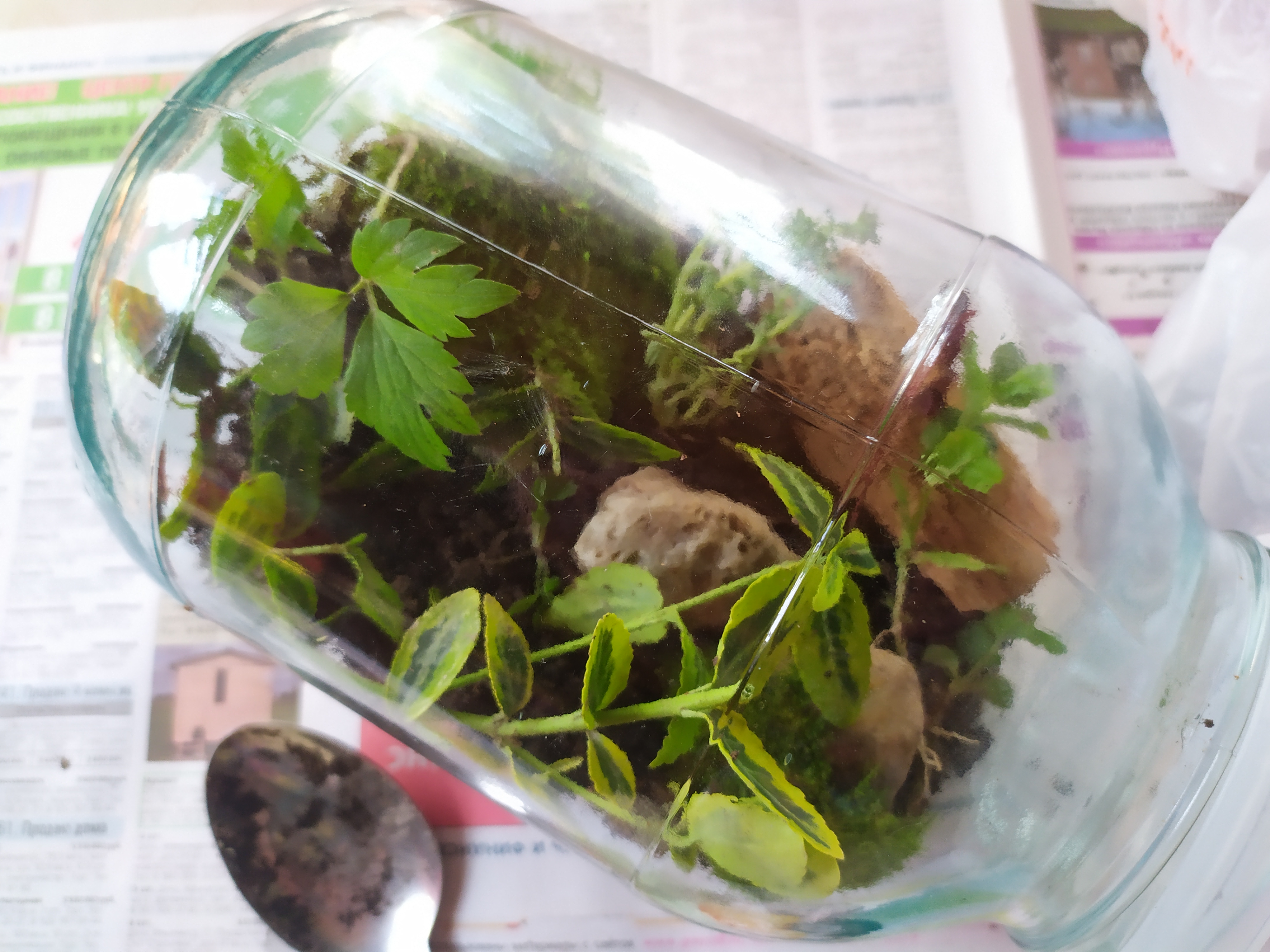 Поэтому пришлось досадить растения. Те же кислица, крапива и немного мха, что и во вторую банку.
