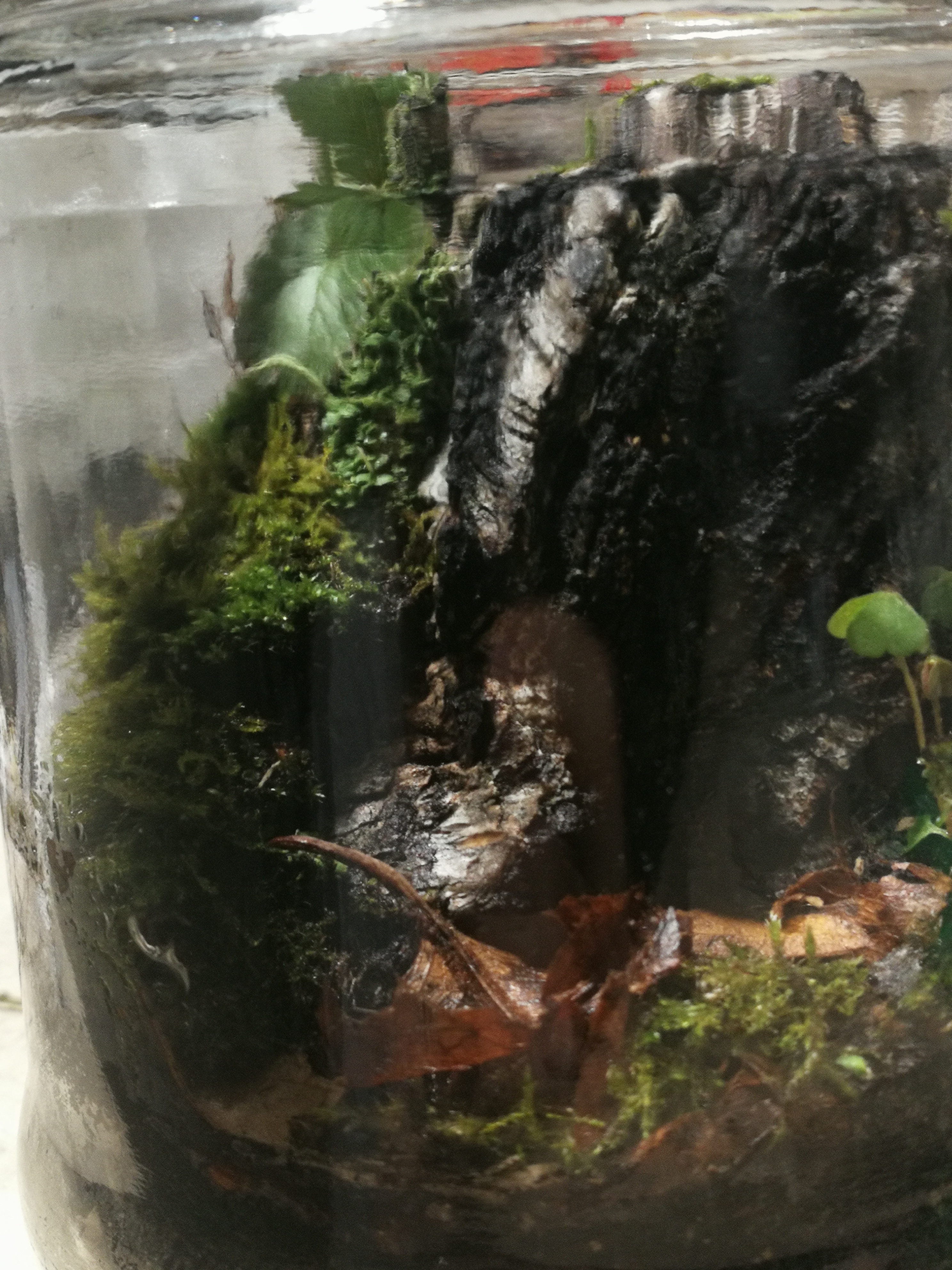 Банка от сока меня не радует. Там всё сдохло ещё осенью. Не ожидал. Вся живность. Там абсолютно мертво. Даже растения. Даже мох не растёт, а тот, который остался на куске коры, не увеличивается в размерах. Последние месяцы крышка заменена на марлю, чтобы лишняя влага испарялась (слишком много воды налил в начале). Думаю, плотно закрывал зря. Там много было гниющих растений (и трупов животных), плюс живые животные - кислорода всем не хватило, потому что зелёных растений почти не было. В общем, фейл. Выкидывать пока не буду, хочу чуть позже очистить изнутри стекло от прилипшей грязи и снова закрыть. И посмотреть, будет ли всё же мох расти, когда станет более солнечно. Кроме мха там сейчас есть буквально один росток непонятной травы, но он уже месяц не увеличивается в размерах. Но и не помирает.