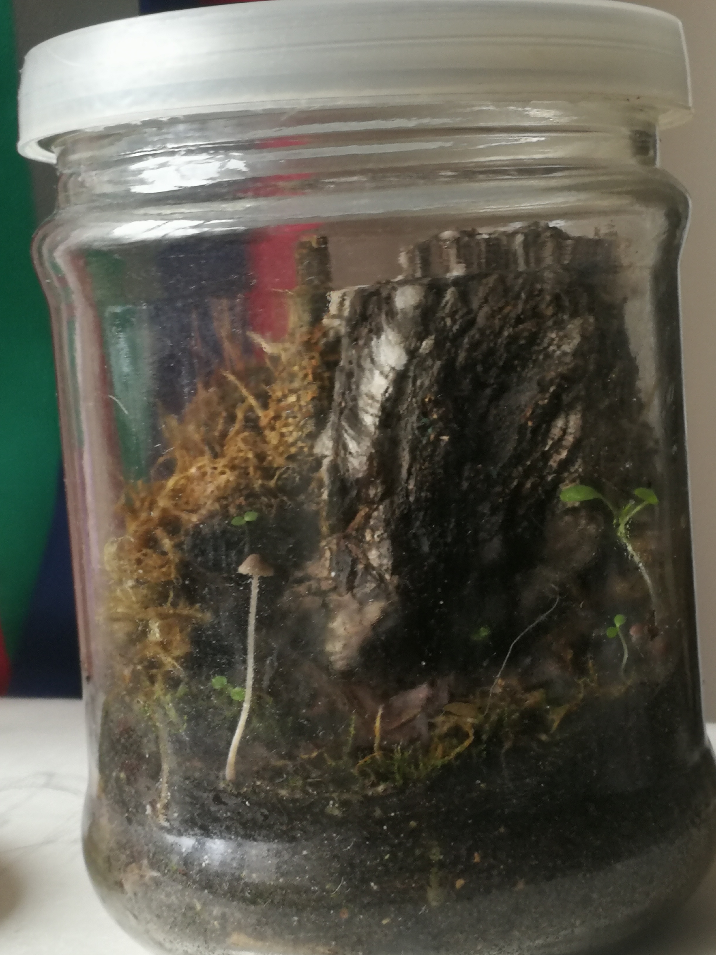 пора вкатиться и мне. вчера надыбал этот тред, сегодня поехал в магазин, купил баночку, фонарик, батарейки и поехал в лес. набрёл на свою любимую полянку. убрал листву, собрал землю с какими-то мелкими гнилыми палочками, пруф пик 1 прилагаю. несмотря на морозец живности было много, особо крупную пришлось отбрасывать. поковырял деревца, пни и в итоге у меня несколько видов мха (надеюсь это не один и тот же мох на разных стадиях развития), какой-то коричневого цвета цветочек (таких больше нигде не видел), маленький гриб того же цвета и росток какой-то травы, вроде бы клевер. мох срезал с дерева вместе с корой, естественно слой небольшой толщины, ибо баночка маленькая. гриб рос в пне, его тоже срезал с кусочком пня, его протолкнул в землю, только слишком сильно, ибо кроме его шляпки на поверхности земли ничего нет. дома слегка полил водой, присобачил диодный фонарик и радуюсь жизни.