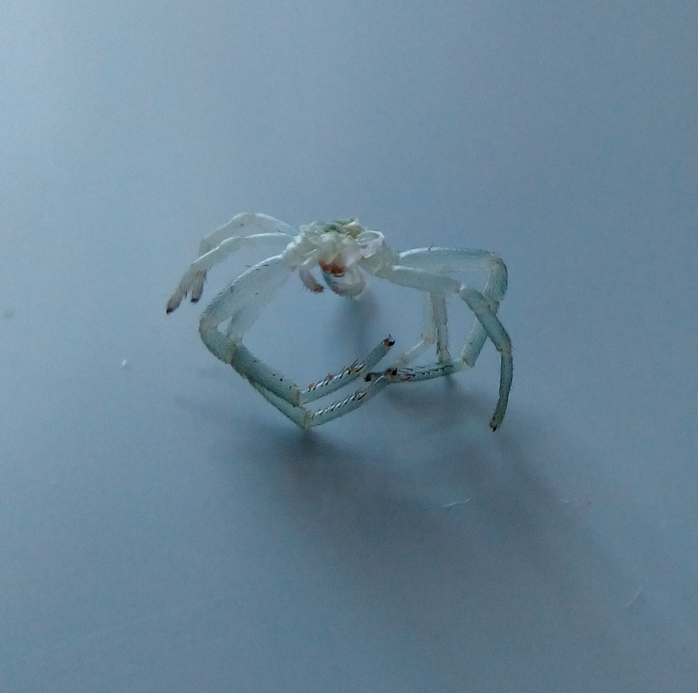 Экзувий мисумены, вид спереди. Видно, что передняя левая нога слабее правой и на ней нет ловчих щетинок. Эту ногу паук регенерировал. После линьки нога уже с щетинками, но небольшая разница в размере осталась.