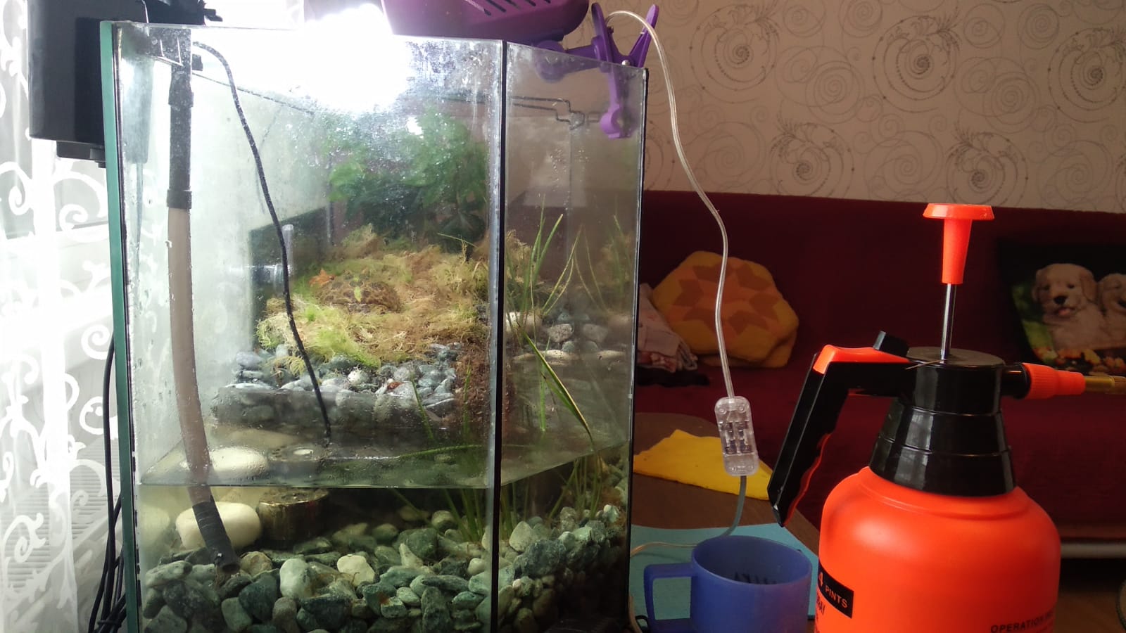 Оба фильтра не чистил как минимум с сентября. Никто не умер. Я думаю, что это из-за того, что очень много растений. Я туда посадил почвопокровку. Поэтому токсичные вещества не копятся, а сразу съедаются растениями.