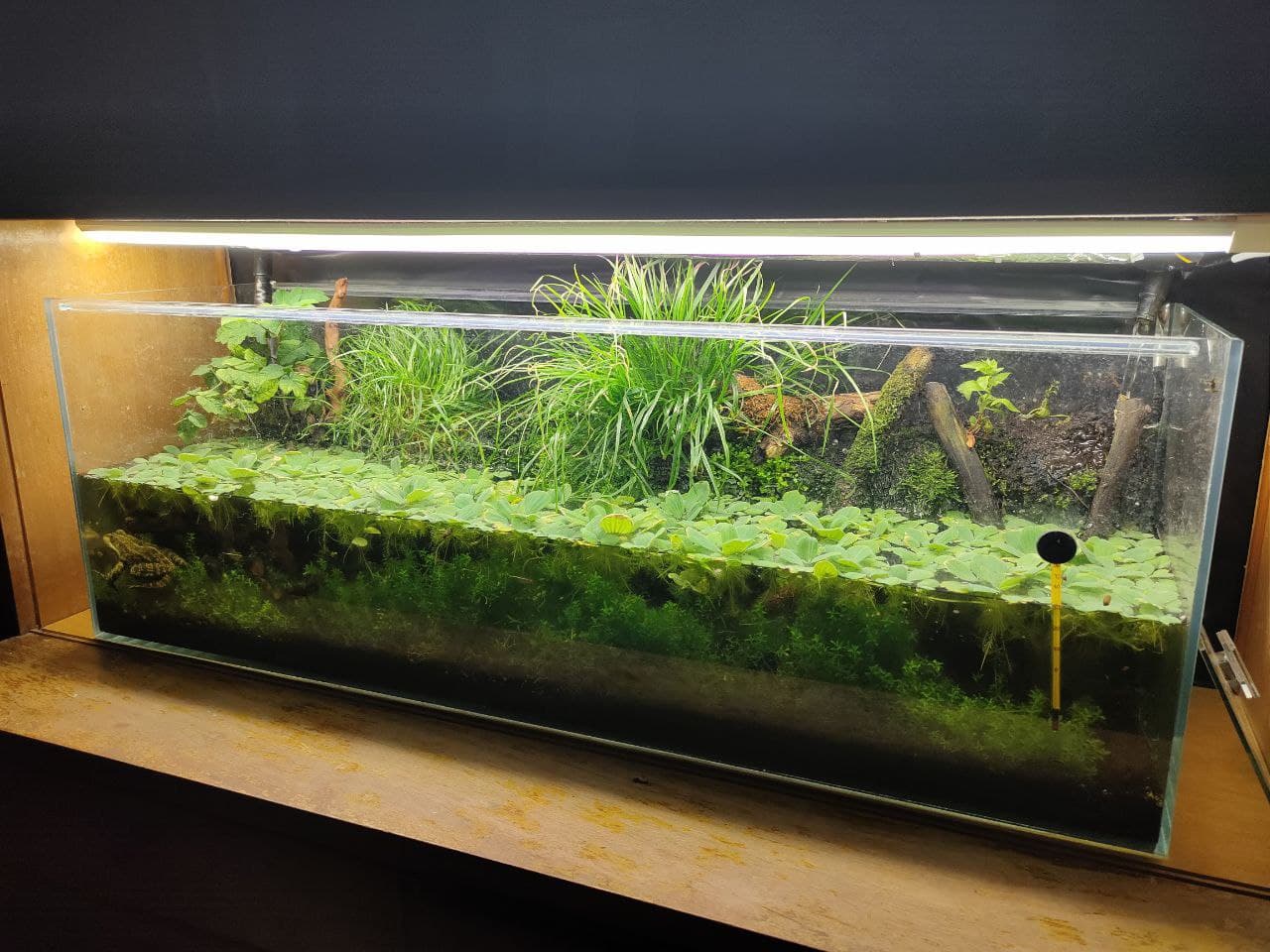 Пока что думаю оставить так как есть. Куплю стекло и клей сделаю новый на размер всего стола. И буду клепать полудариум, от их эстетичности я прям кончаю. Но геморой с растениями. Что в общем посоветуешь садить? Или все растения засунуть в горшки?