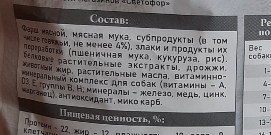 На первом месте фарш мясной, хз из какого мяса, то есть это самый дешевый фарш из остатков курей, который еще усушился в 5 раз и по факту на арену выходит второй ингридиент кости мясные перемолотые, ну такое