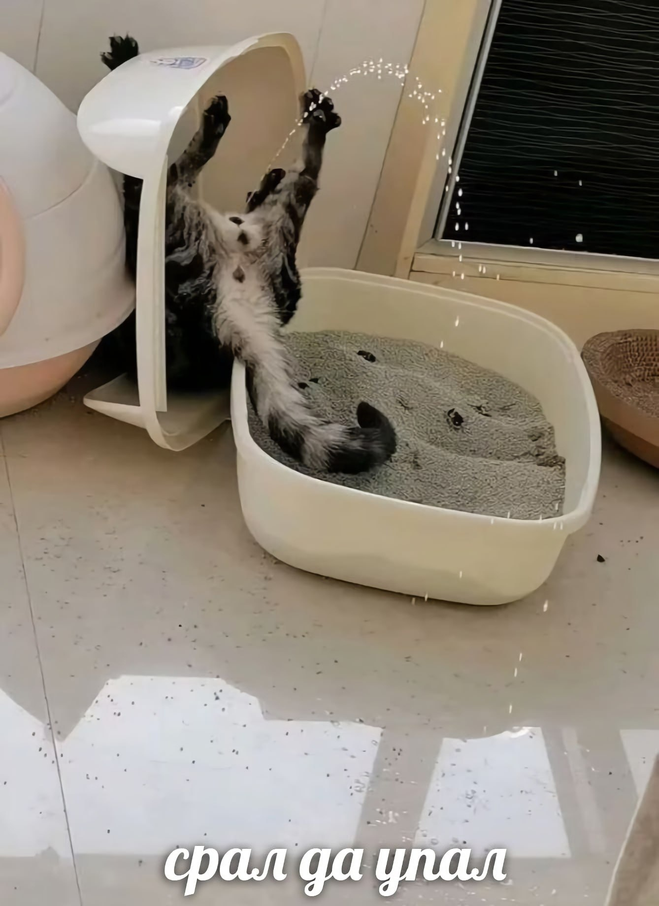 Через часов 8 нассал на пол, по советам бывалых сгенерированных нейронками сайтов собрал мочу толканкой и положил в лоток. Коту всё ещё похуй (разве что позакапывал немного), я решил что он боится наполнителя и весь наполнитель ссыпал, положив ссаную бумажку под второе дно лотка, сделав лоток полностью ровным, но вонючим.