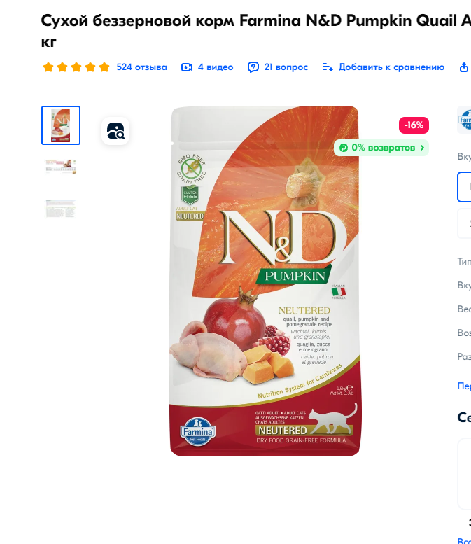 Кормление Опасные продукты: шоколад, авокадо, виноград, рыба с костями. Опасные в долгосрочной перспективе: печень, жирные продукты, рыба. Опасных продуктов очень много, стоит сконцентрироваться на том, что кошке можно. Неоднозначные продукты: 1. Коровье молоко - кроме того, из состава которого убрали лактозу. Может привести к серьёзным последствиям. А может и не привести (как повезёт, во многом зависит от организма кошки, перестанет он усваивать лактозу или нет). Козье молоко и _коровье молоко без лактозы_ можно давать, но если это не будет вызывать проблем с пищеварением. Однако есть мнение, что в целом молоко вносит дисбаланс в кормление, и стоит его избегать. 2. Любые другие жидкости, кроме хорошей питьевой воды. Чем кормить? Вариант 1. Натуралка !найти ГОДНУЮ инструкцию! Этот вариант очень сложный, он для МЕНЬШИНСТВА. Вариант 2. Качественный (с хорошим составом, как правило, это определяется в первую очередь отсутствием зерна, злаков и т.п.) корм. Либо сухой + жидкий (можно разных марок), либо только сухой. Можно иногда давать что-то "со стола", например, сырое мясо, курицу. Смысл еды "со стола" в таком случае? Пожалуй, отсутствует. Несмотря на рейтинг >сухих> кормов (feedsmart.ru), большинство адекватов рекомендуют Farmina N&D, Grandorf, Monge. Это просто факт, чем это обусловлено? Тут очень много факторов. Естественно один из них - состав. Monge в РФии под вопросом (санкционным вопросом). Grandorf содержит меньше мяса, чем другие два. Поэтому на текущий момент самый правильный попсовый выбор - Farmina N&D. Из жидких - ищите те, где отсутствует зерно, среди них выбираете тот, где больше всего мяса (именно мяса, а не субпродуктов на основе чего-то там). В составе именно так и должно быть написано. Ещё очень важный фактор жидкого корма - его консистенция, насколько он плотный. Из дешёвых (дишманских, нищих) вариантов по консистенции самый хороший - Perfect Fit. Из вариантов подороже можно выделить Crave. Менее плотные жидкие корма проще усваиваются, поедаются. Но в целом это очень субъективный фактор, не стоит делать выбор на основании этого. Есть масса историй о том как, пожалуй, самый плотный из жидких кормов, Purina ProPlan, приводил к запорам. Но это также субъективно. В целом, много кормов категорированные: для стерилизованных, для котят, диетические корма, корма в случае определённых заболеваний, и т.п. Это всё стоит учитывать. Переход, в случае сухих кормов, с одного типа корма на другой, делается постепенно. Покупать корм можно на petshop.ru, 4lapy.ru, sbermegamarket.ru и т.п. ресурсах.