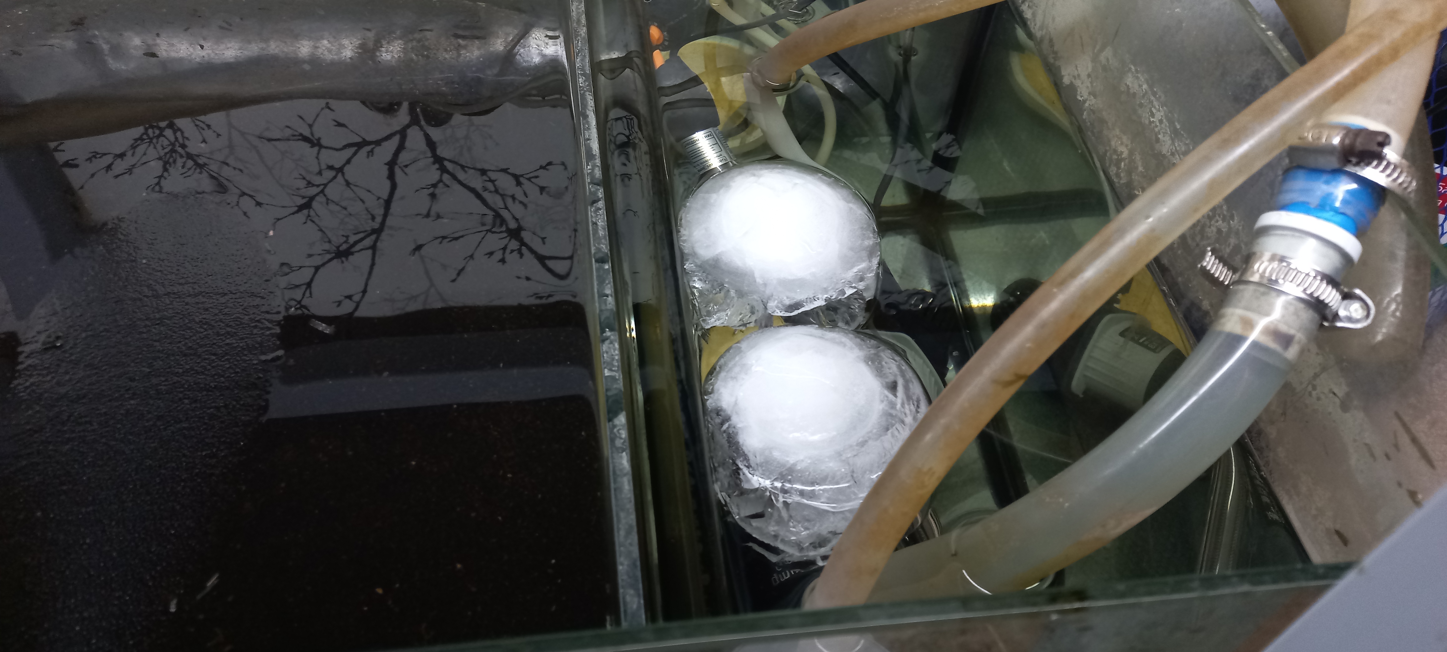Проложил на постоянку два шланга от банки до ванной через всю квартиру. Сначала хотел использовать просто гофру но она внезапно оказалась дырявой как решето, так что внутрь были засунуты шланги. В самп закинута помпа которая управляется через релеху контроля уровня жидкости. В ванной через приблуду сделал 2 душевых шланга, один из которых соответственно через проточный фильтр идет на залив. Дальше в другой комнате стоит 100л бочка, в нее заливается вода чтоб она отогревалась до комнатной температуры плюс можно было точно отмерять объем подмены, в этой бочке лежит еще одна помпа которая уже перекачивает воду в банку.