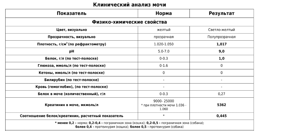 Плотность: 1,017 г/см³. Это самый важный и тревожный показатель в анализах. Норма для кошки — выше 1,035. Плотность мочи показывает, насколько хорошо почки могут концентрировать мочу, т.е. задерживать воду в организме. Если бы проблема была только в обезвоживании, здоровые почки изо всех сил старались бы сохранить воду, и моча была бы очень концентрированной (плотность 1,050 и выше). У вашей кошки моча неконцентрированная (состояние, близкое к изостенурии). Это значит, что почки потеряли способность концентрировать мочу, даже когда организм остро нуждается в воде. Это классический признак почечной недостаточности. Кошка не может удерживать воду, поэтому легко впадает в обезвоживание, даже если пьет. pH: 9,0. Очень щелочная моча. Это может быть связано с тем, что анализ не свежий (бактерии в моче со временем повышают pH), или с наличием инфекции мочевыводящих путей. Это требует внимания. Белок в моче (количественный): 0,27 г/л и Соотношение белок/креатинин: 0,445. Оба показателя подтверждают протеинурию (повышенное содержание белка в моче). Норма для соотношения у кошек — до 0,4. Когда почечные клубочки повреждены, они начинают "пропускать" белок из крови в мочу. Это еще один прямой признак заболевания почек.
