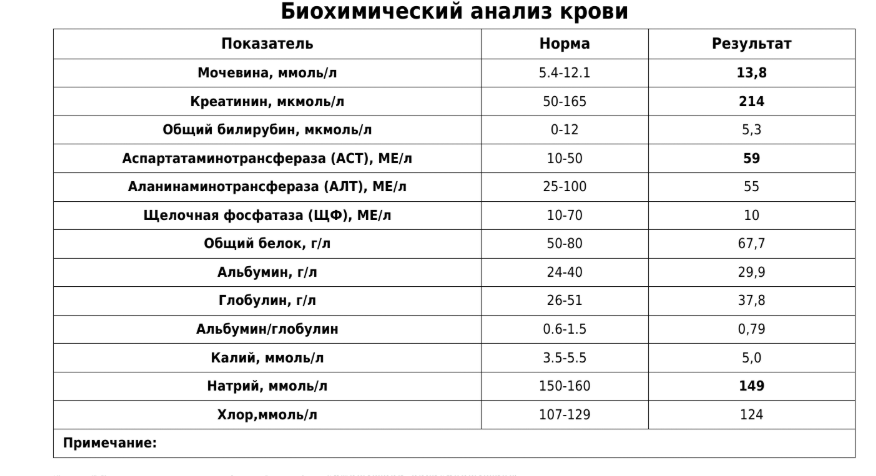 Креатинин: 214 мкмоль/л (норма 50-165). Это основной маркер фильтрационной способности почек. Он повышен. Обезвоживание действительно повышает креатинин (это называется преренальная или "допочечная" азотемия), потому что сгущается кровь и падает скорость фильтрации. Мочевина: 13,8 ммоль/л (норма 5.4-12.1). Тоже повышена. Мочевина — менее специфичный маркер, чем креатинин. Она повышается не только при проблемах с почками, но и при обезвоживании, а также при питании с высоким содержанием белка или при его распаде в организме (например, из-за голодания). Соотношение: У вашей кошки повышены оба показателя, что называется азотемия. Вопрос в том, вызвана ли она только обезвоживанием (преренальная) или проблемой в самих почках (ренальная). Ответ на этот вопрос дает анализ мочи. Фосфор: 1,36 ммоль/л (норма 1.1-2.3). Это очень хороший знак! Фосфор в норме. При прогрессировании ХПН почки перестают выводить фосфор, и он накапливается в крови, что очень токсично. То, что он в норме, подтверждает, что речь идет о начальной стадии заболевания. АСТ: 59 МЕ/л (норма 10-50). Незначительное повышение. АСТ содержится не только в печени, но и в мышцах. Такое повышение может быть связано с мышечным истощением из-за отказа от еды. Это не является сейчас главной проблемой. Натрий: 149 ммоль/л (норма 150-160). На границе нормы, ближе к верхней. Это также может указывать на обезвоживание.